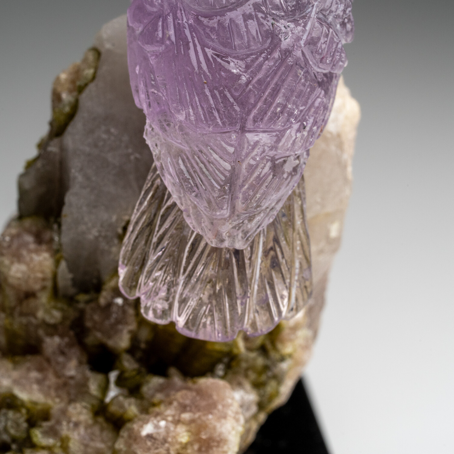 This Owl carving is a unique piece of art, carved from museum-quality fluorite with onyx eyes and a carnelian beak. The owl is perched atop a green tourmaline and quartz matrix and mounted on a custom stand for convenient display. This sculpture is hand-carved and crafted by master artisans.