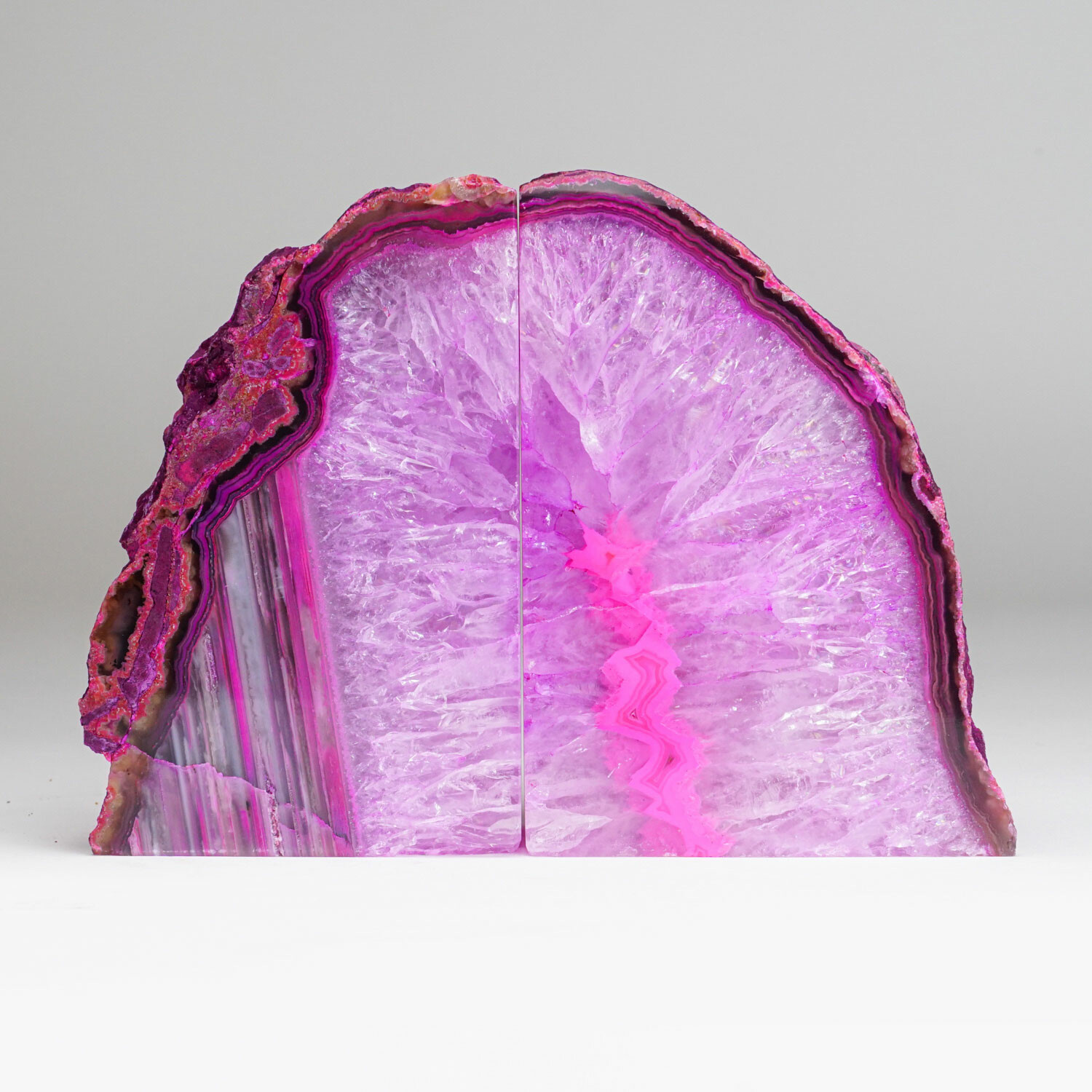 Sliced from semiprecious stone, these bookends are a dramatic way to anchor books on a shelf or table. The druzy stones are formed in ancient lava streams in the mountains of Brazil and combine agate, and quartz in layers of luminous color. Artisans polish each one by hand, leaving the stony edge untouched. This pair of bookends showcases an electric pink color. Agates are about overall harmony and balance. It cleanses and stabilizes the aura, eliminating and transforming negativity. Agate enhances mental function, improving concentration, perception and analytical abilities. It soothes and calms, healing inner anger or tension and creates a sense of security and safety.