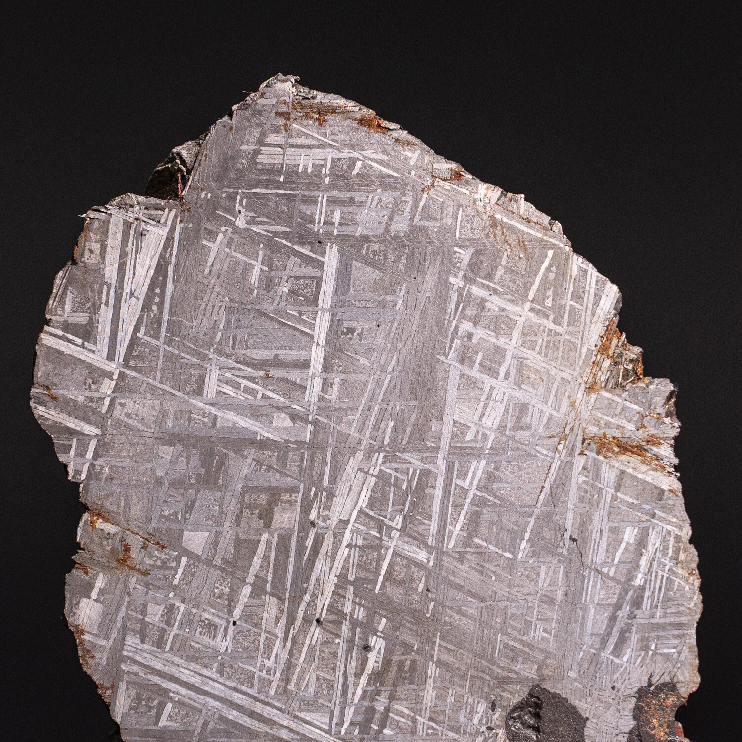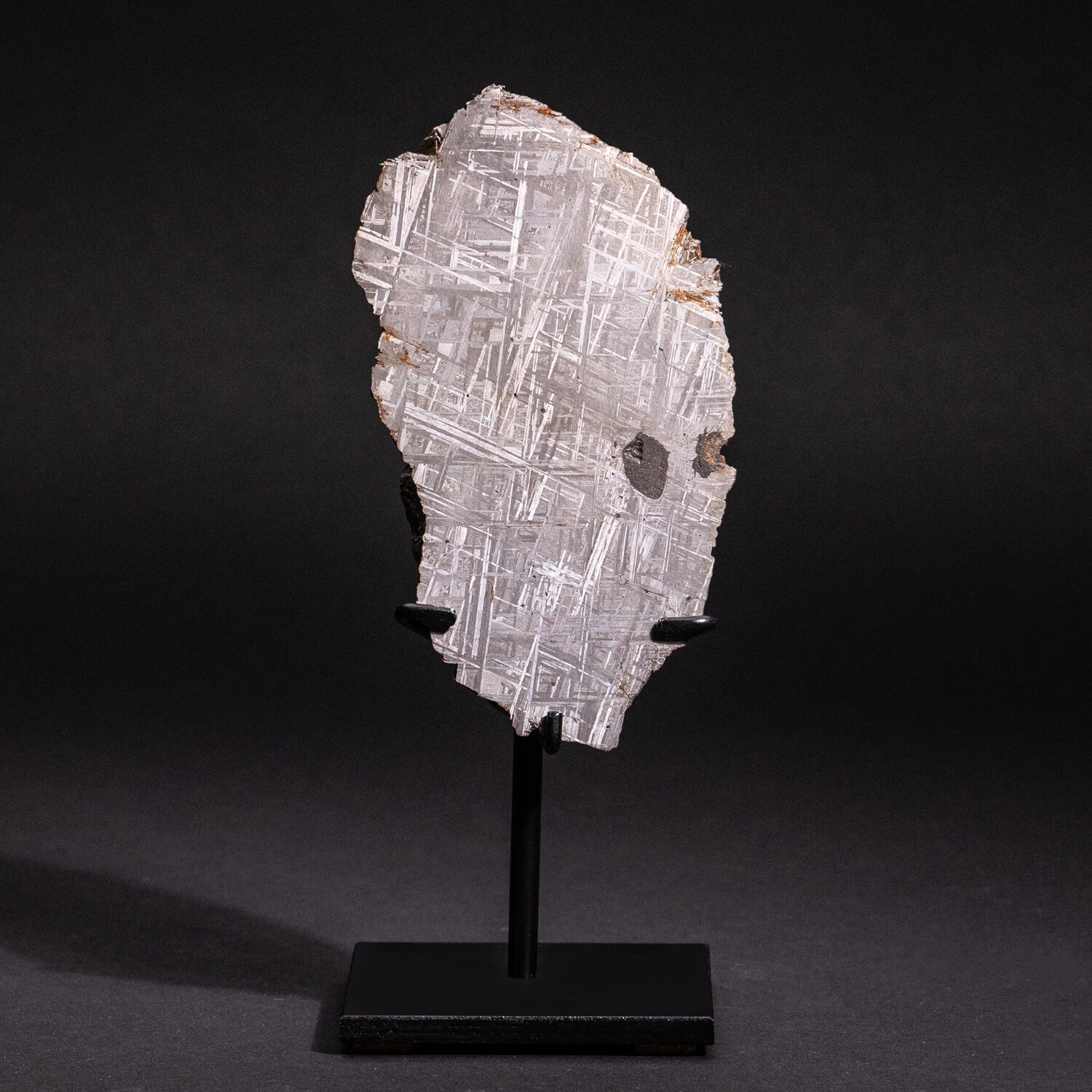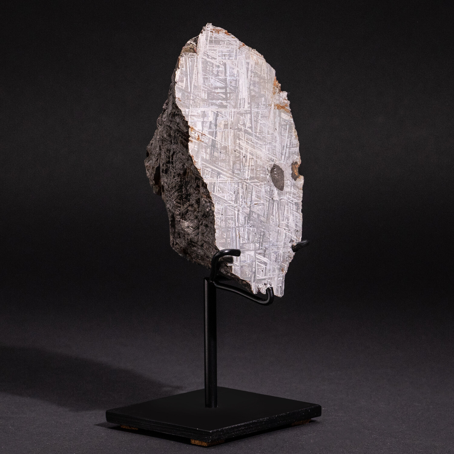 A stunning piece of natural history, this meteorite is a natural Muonionalusta Meteorite with one side sliced and polished to show its beautiful, metallic Widmanstätten pattern. The Muonionalusta is a meteorite classified as fine octahedrite, type IVA (Of) which impacted in northern Scandinavia, west of the border between Sweden and Finland, about one million years BCE. The meteorite was first described in 1910 by Professor A. G. Högbom, who named it "Muonionalusta", after a nearby place on the Muonio River. Truly a unique addition to any collection, this piece is mounted on a custom black metal stand for convenient display.