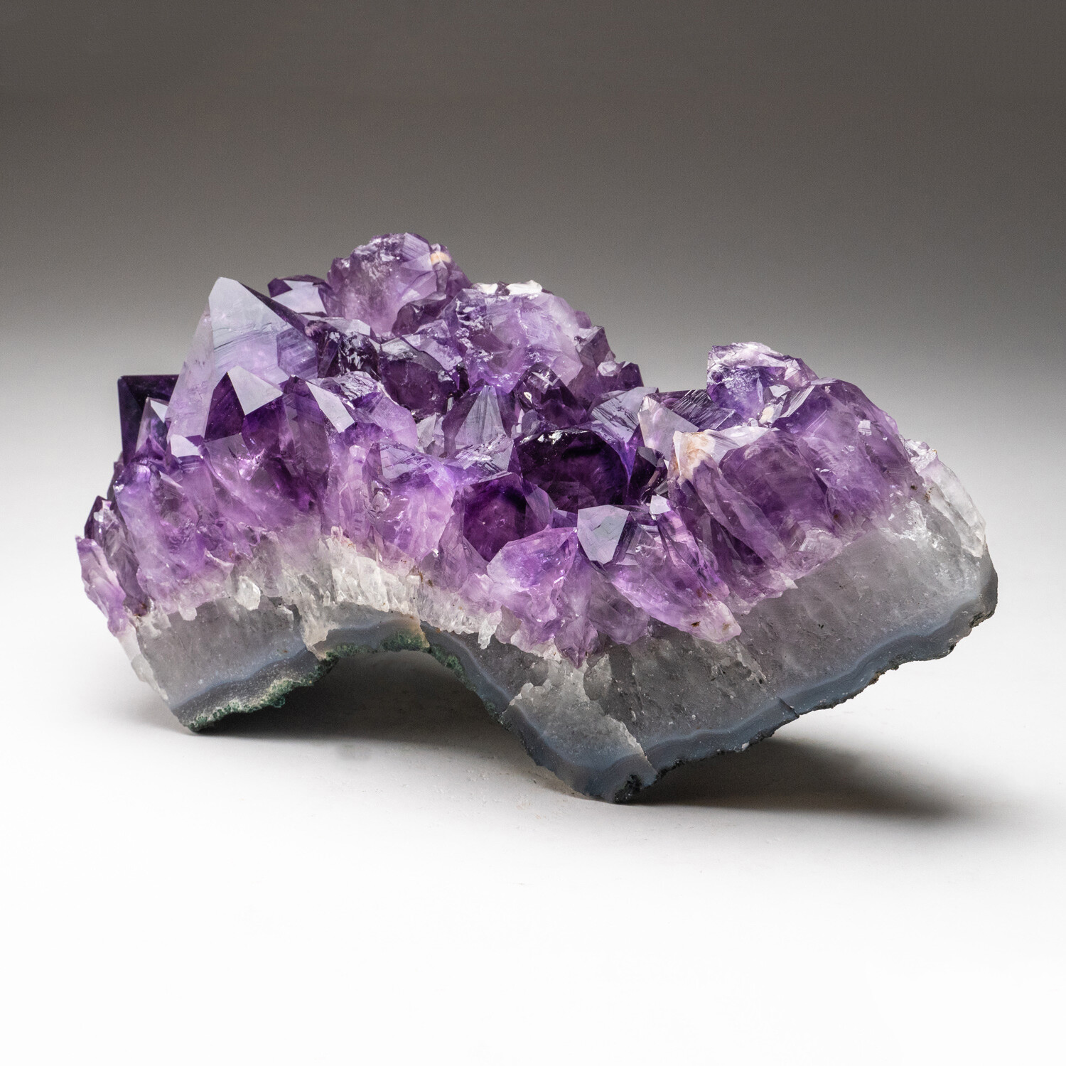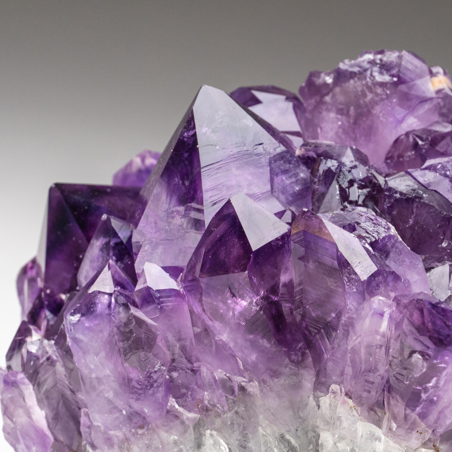 This AAA-quality, natural formation of amethyst cluster features lustrous fully terminated crystals with highly reflective faces and deep transparent to translucent super grape color. This piece is hand polished and would make a beautiful statement piece in any interior. Display on a shelf, or use as a unique centerpiece.