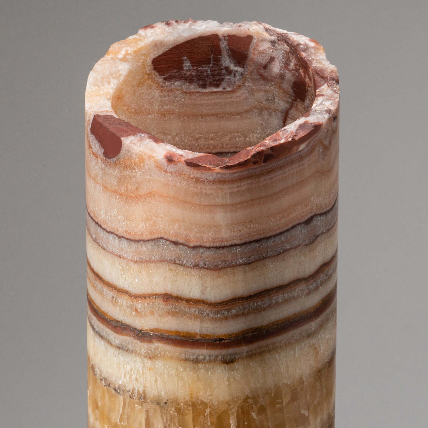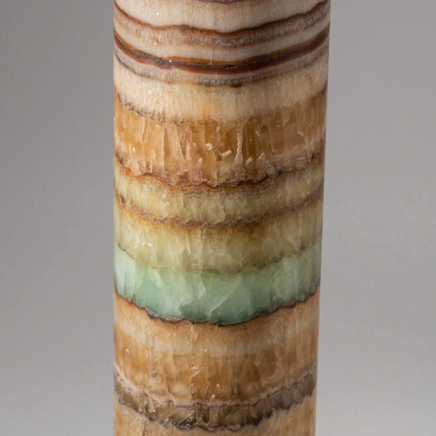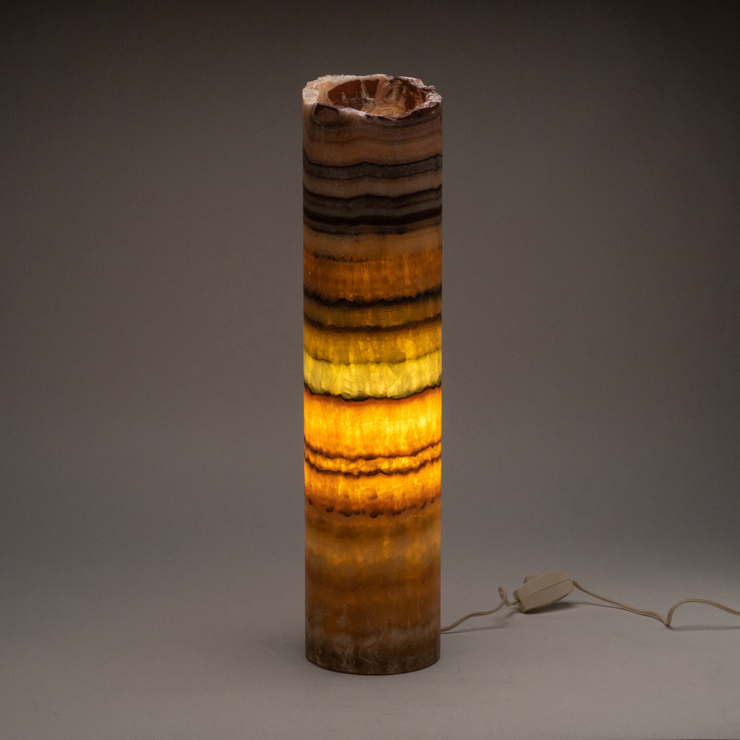 This large cylindrical lamp is crafted from multi-colored banded Mexican onyx for a standout piece with sophisticated and warm appeal. The cylindrical lamp will look great in your home as a perfect accent to lighting in various rooms.