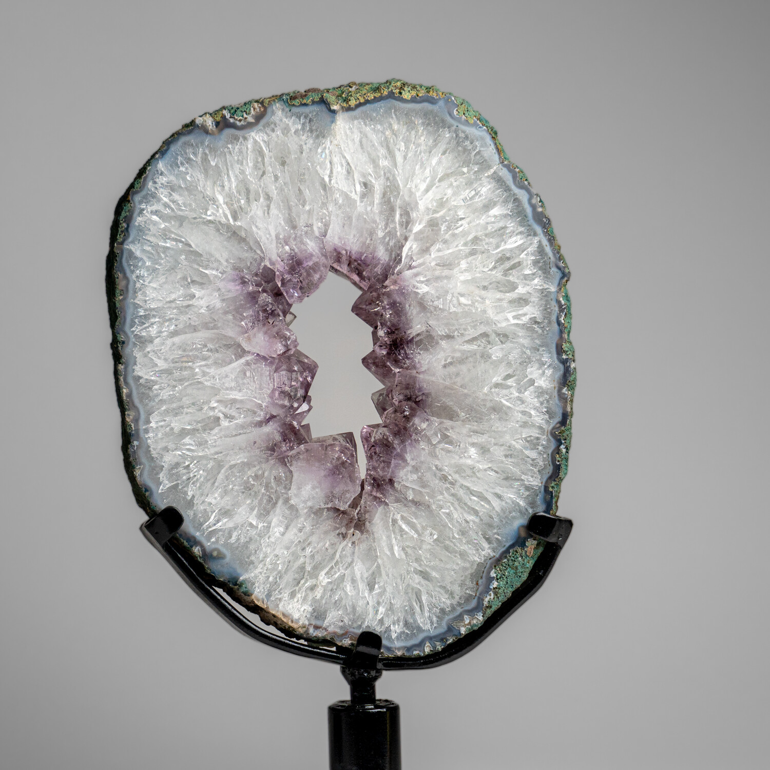 This top museum quality Amethyst Quartz geode slice features naturally formed, lustrous and fully terminated with highly reflective faces and a deep, transparent to translucent hues. This beautiful specimen comes with a metal stand and is perfect display piece.