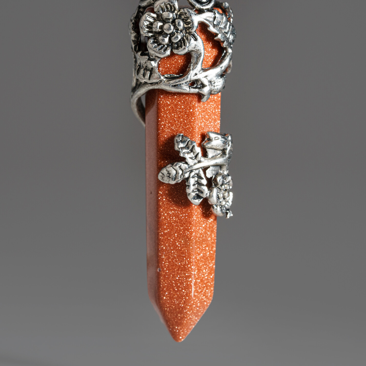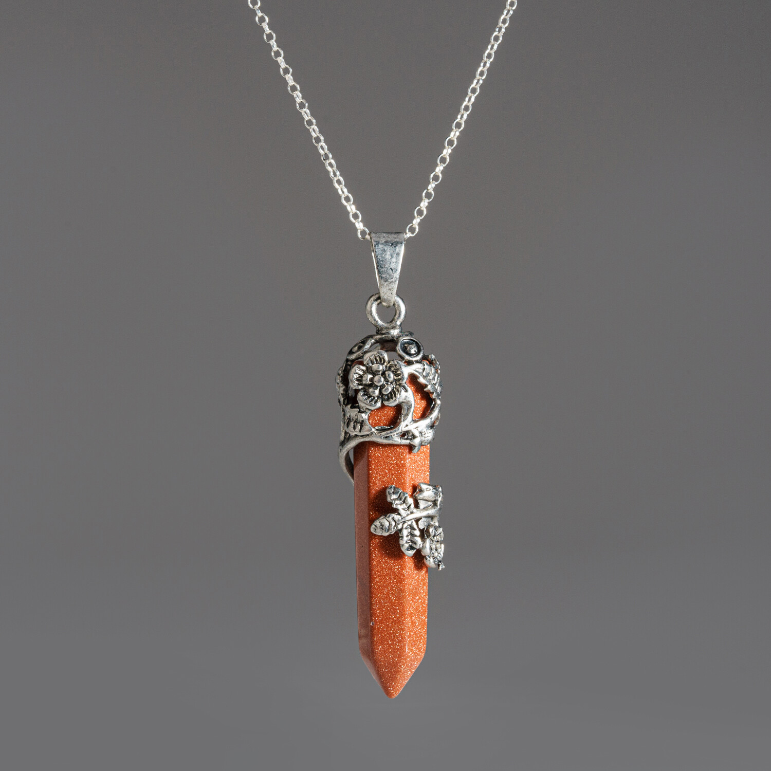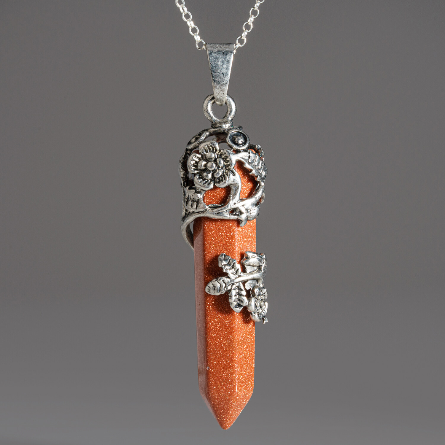 Natural Goldstone crystal that has been shaped into a hexagon point pendant. This point is wrapped in sterling silver which features flowering detail throughout. The pendant includes an 18" sterling silver chain.