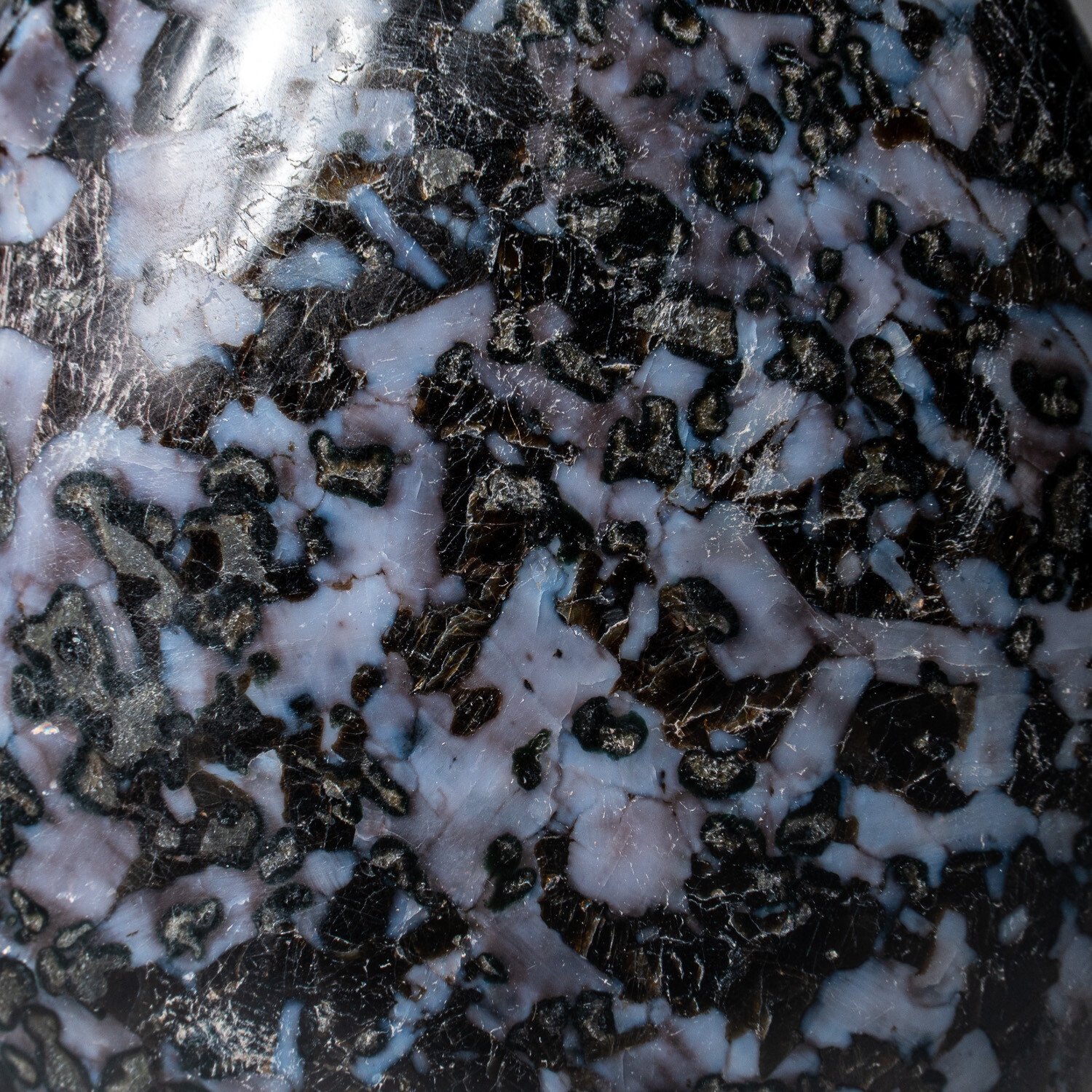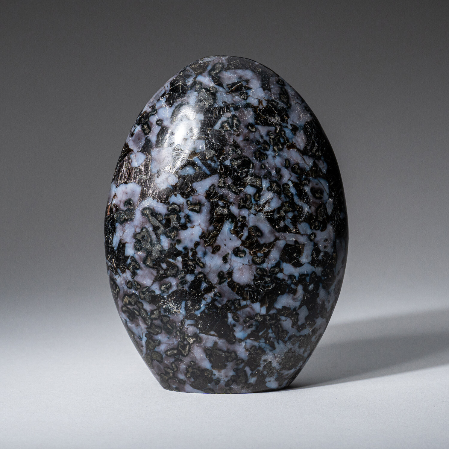 This beautiful, hand-polished, freeform, is carved from a solid piece of natural polished indigo gabbro (aka Mystic Merlinite). Indigo gabbro metaphysical properties focus on knowledge and insight. It's said to help people learn about their innermost selves. Others believe the mystic merlinite metaphysical properties concentrate more on traits like strength and courage.