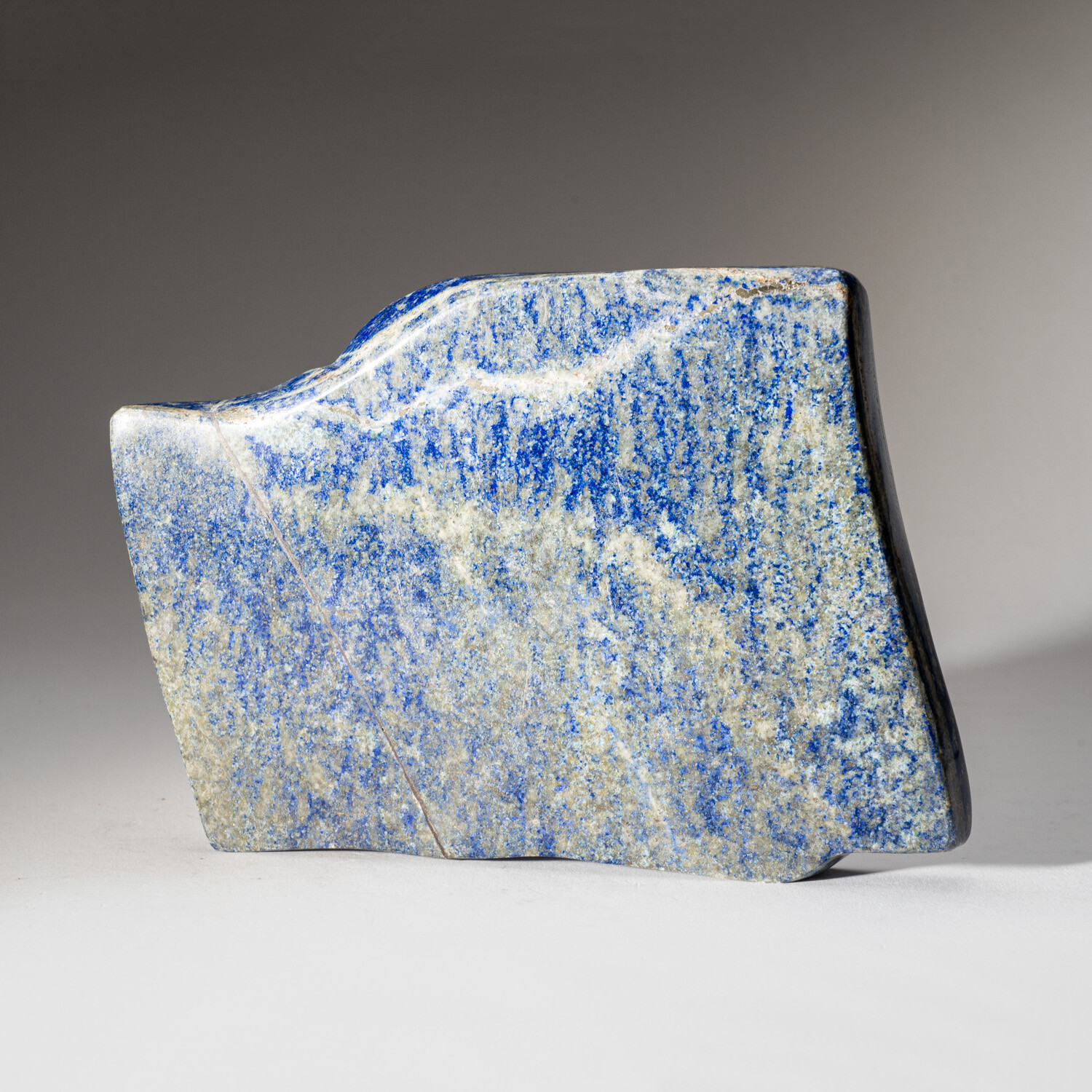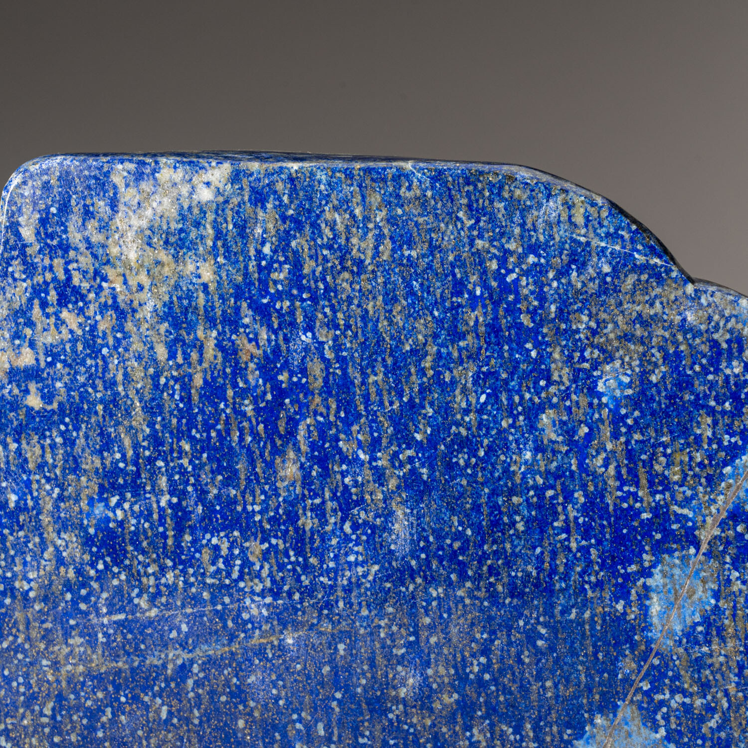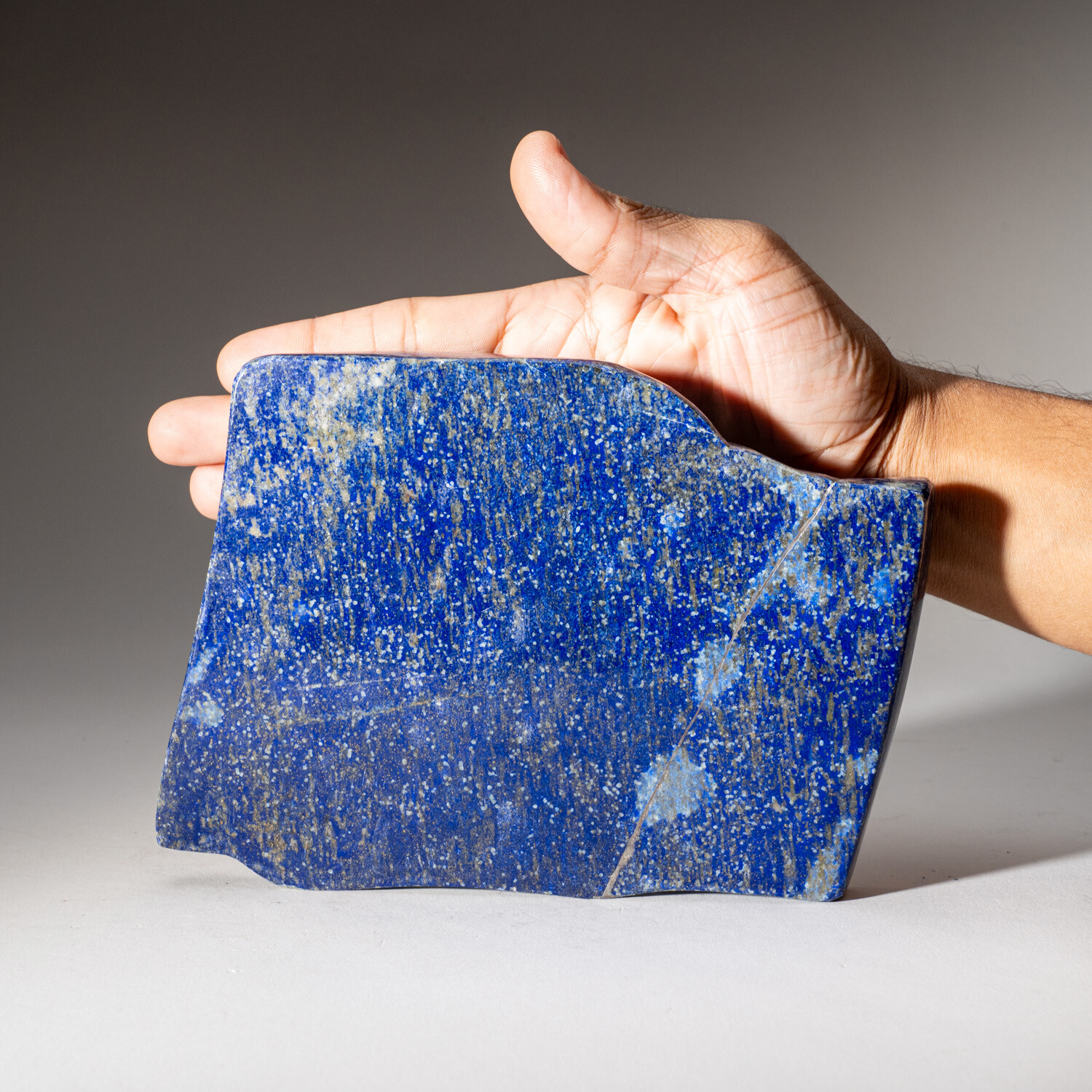 This gem quality freeform is carved from natural, solid, Lapis Lazuli. This piece is highly saturated with royal blue coloring and attractive pyrite microcrystals. Lapis lazuli is an aggregate of several minerals. Lazurite grains provide its characteristic color. The higher the percentage of lazurite grains in the aggregate, the darker the blue color. This freeform is an exceptional example of this, as it has a smoothly uniform bodycolor. Since the earliest of times, lapis lazuli has been associated with strength and courage, royalty and wisdom, intellect and truth.