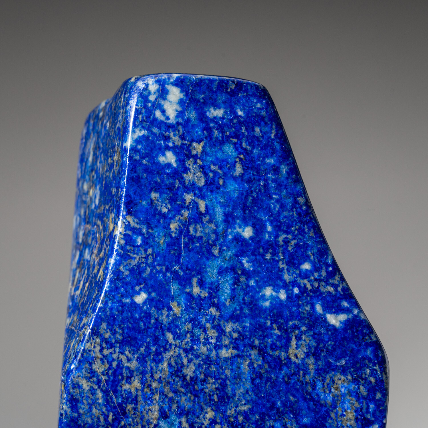 This gem quality freeform is carved from natural, solid, Lapis Lazuli. This piece is highly saturated with royal blue coloring and attractive pyrite microcrystals. Lapis lazuli is an aggregate of several minerals. Lazurite grains provide its characteristic color. The higher the percentage of lazurite grains in the aggregate, the darker the blue color. This freeform is an exceptional example of this, as it has a smoothly uniform bodycolor. Since the earliest of times, lapis lazuli has been associated with strength and courage, royalty and wisdom, intellect and truth.