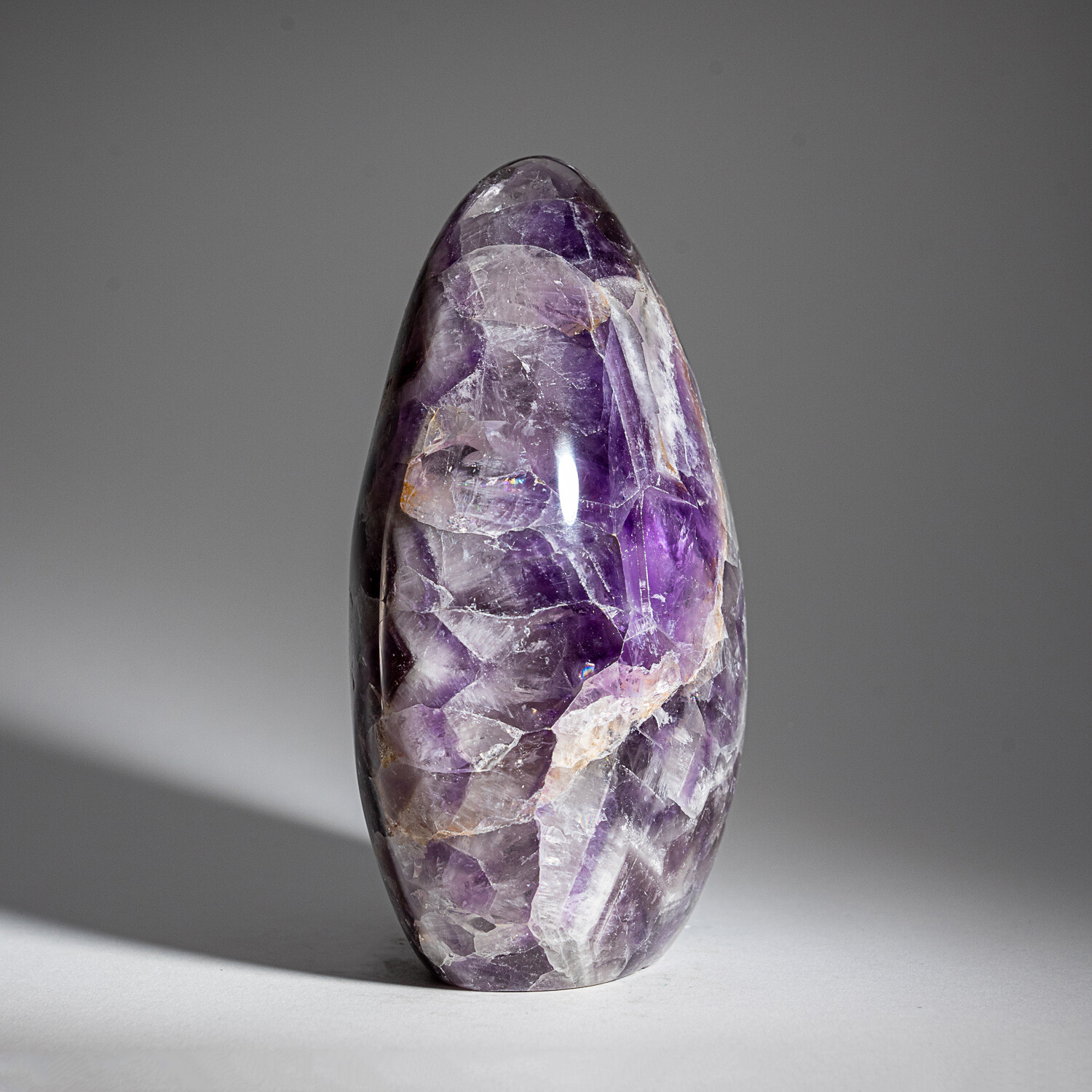 Top-quality, genuine polished chevron amethyst free-form from Brazil. This specimen displays vivid purple color and translucent to transparent clarity. Chevron Amethyst is a combination of Amethyst and White Quartz, mixed together in a V-striped or banded pattern.