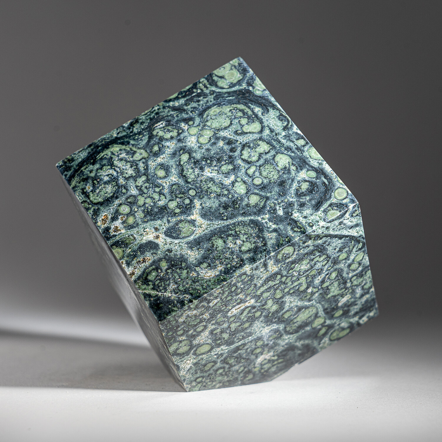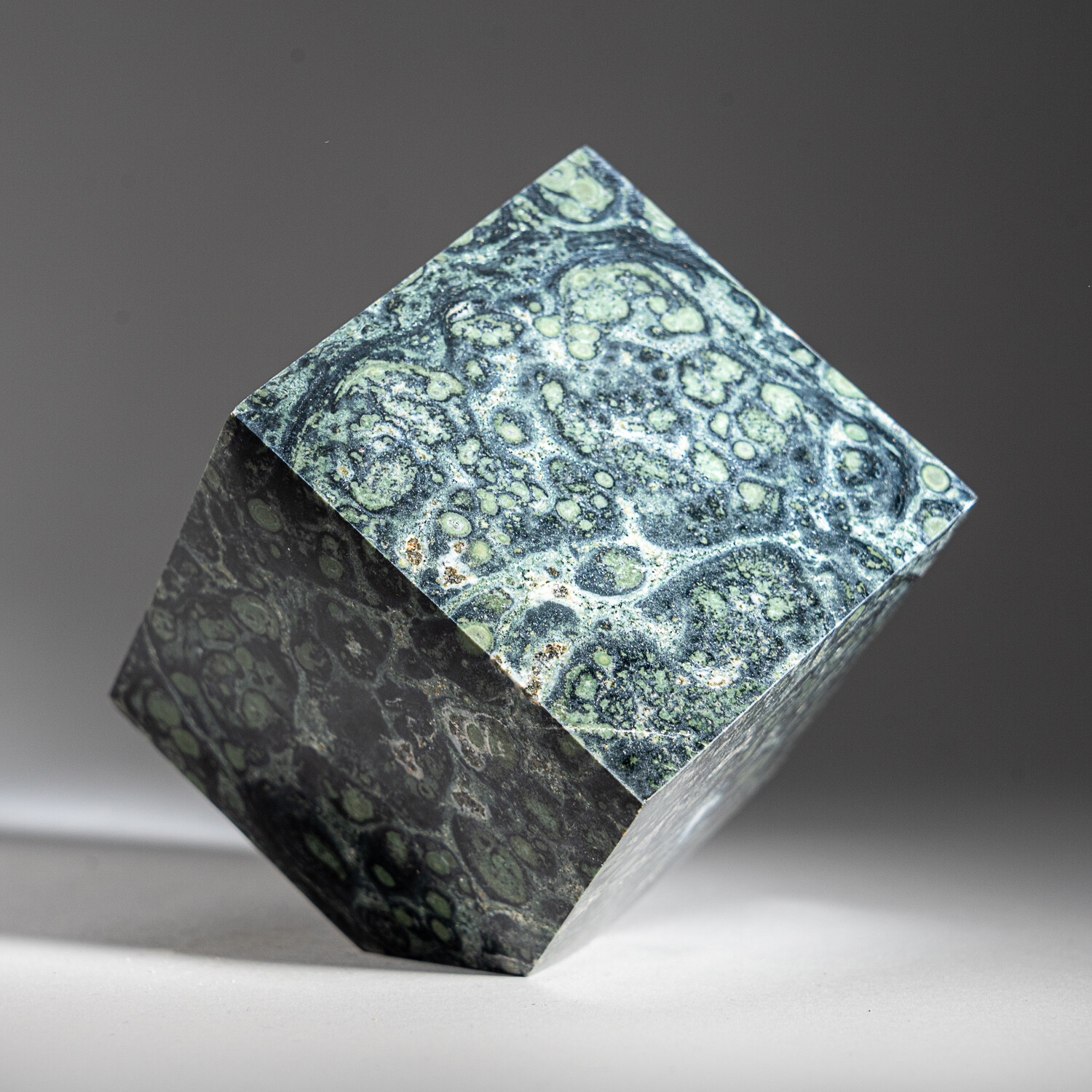 Beautiful, top-quality polished Kambaba-Jasper cube. Kambaba Jasper is a sedimentary stone with green orbicular patterns. This interesting piece is hand-polished on all sides.