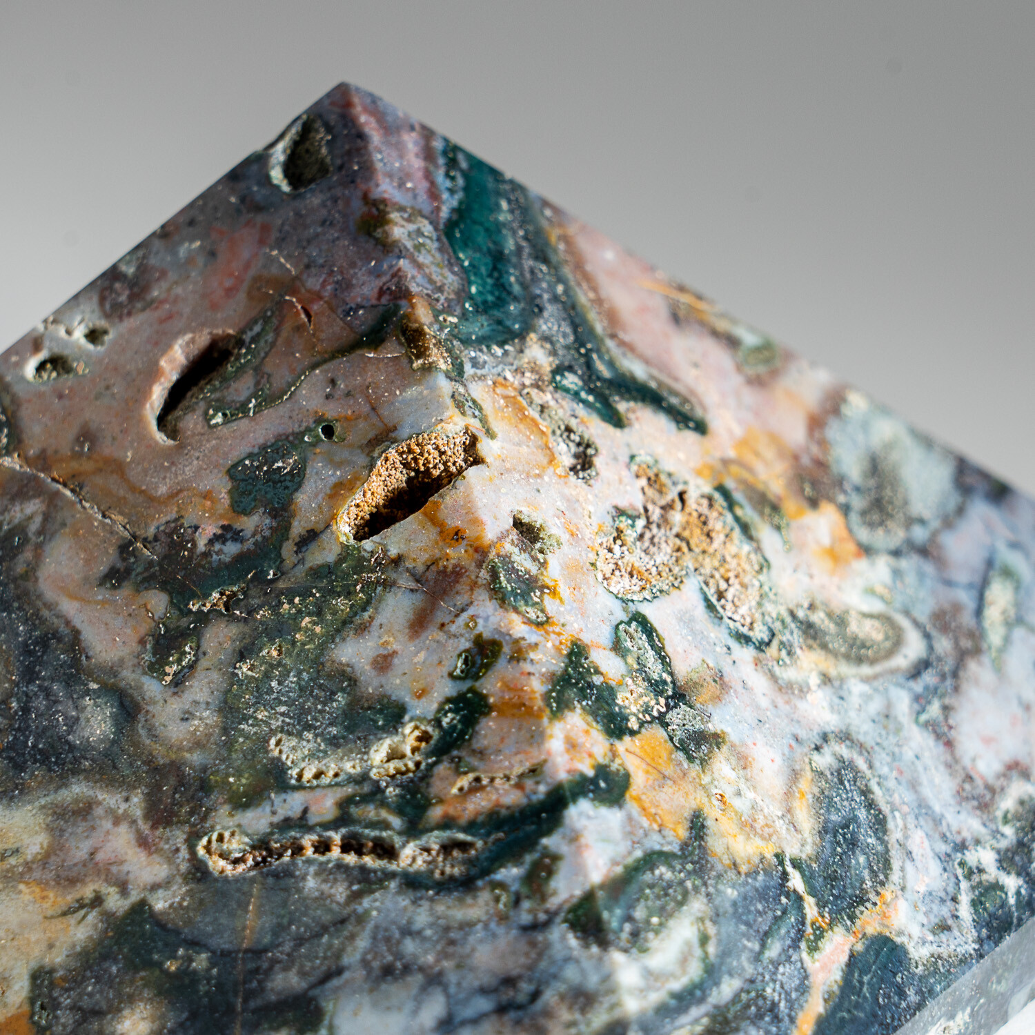 A beautiful genuine polished Ocean Jasper pyramid from Madagascar. This piece has an amazing pattern with vibrant hues of red, green, white and brown. This piece has the typical "pitting" found in most Ocean Jasper specimens.