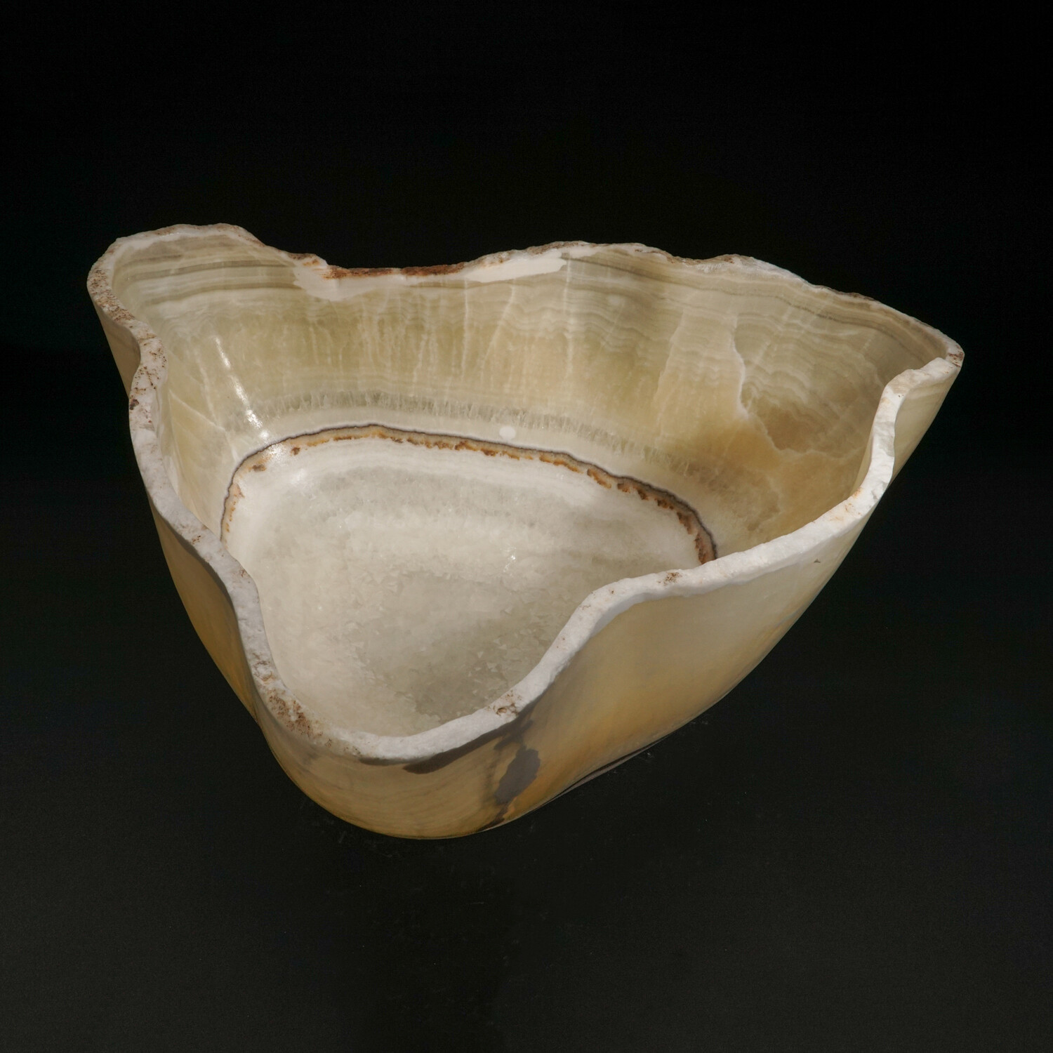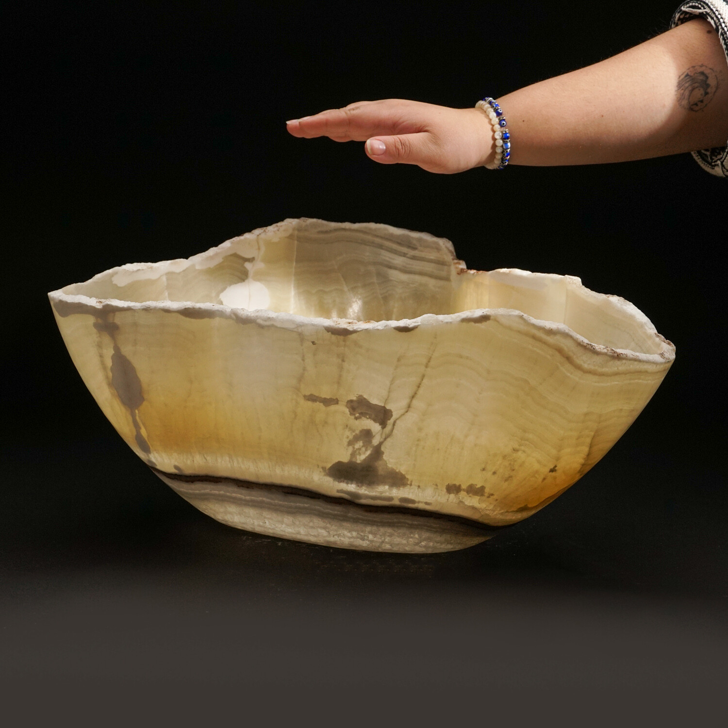Large, one-of-a-kind, free-form natural onyx decorative bowl carved out of a single chunk of banded natural onyx. This incredible piece is polished to a mirror finish. This unique piece blends natural onyx shades of green, white, honey and brown tones. This will make a beautiful centerpiece to complement your home with beautiful translucent banded patterns with muted modern tones that will work with nearly any interior.