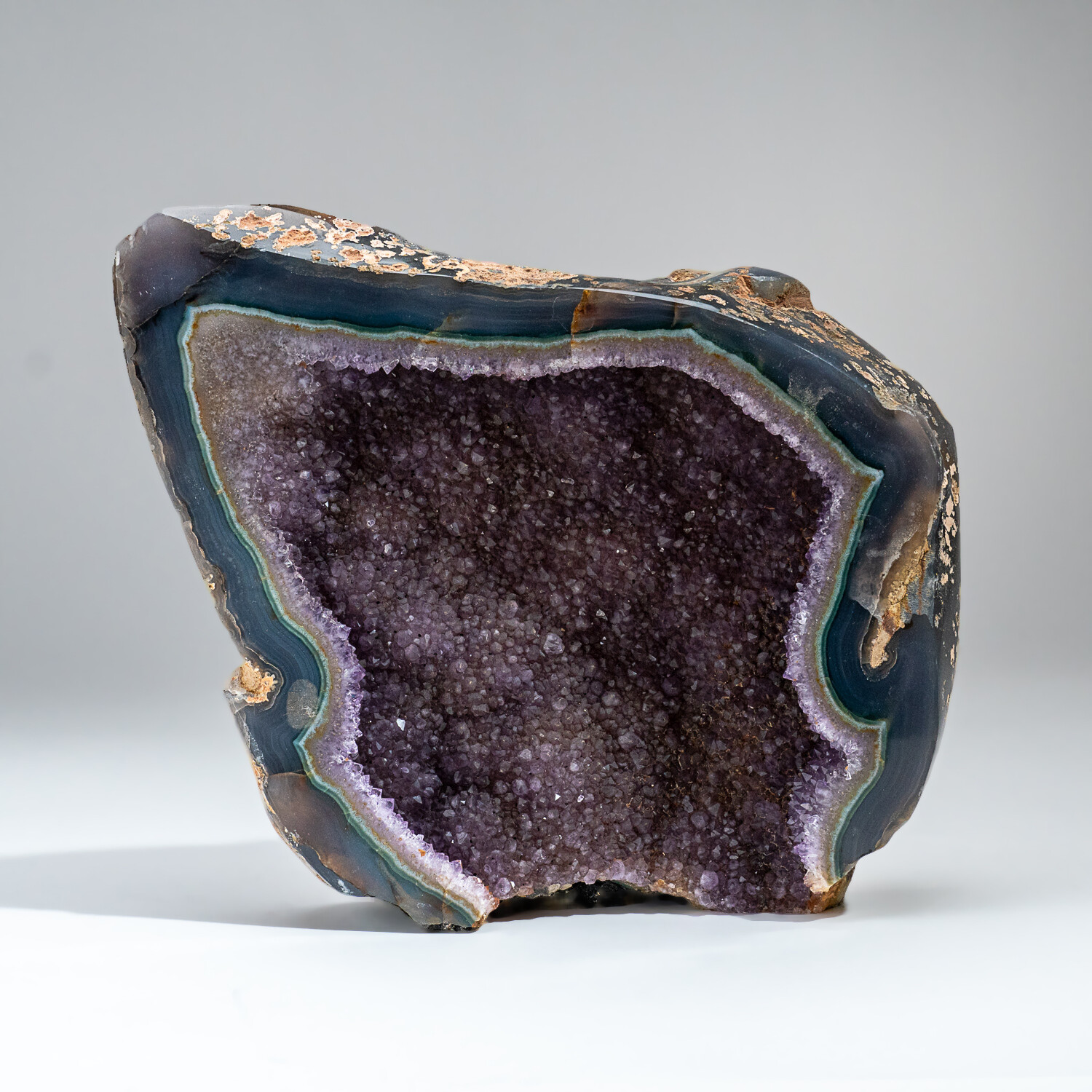 Beautiful genuine Brazilian banded agate sliced geode with a large exposed cavity, lined with lustrous amethyst quartz crystals. The front of this agate slice is polished to a high yield to a glass finish, revealing colorful bands of natural tones. Agates are grounding stones, bringing about an emotional physical and intellectual balance. They aid in centering and stabilizing physical energy.