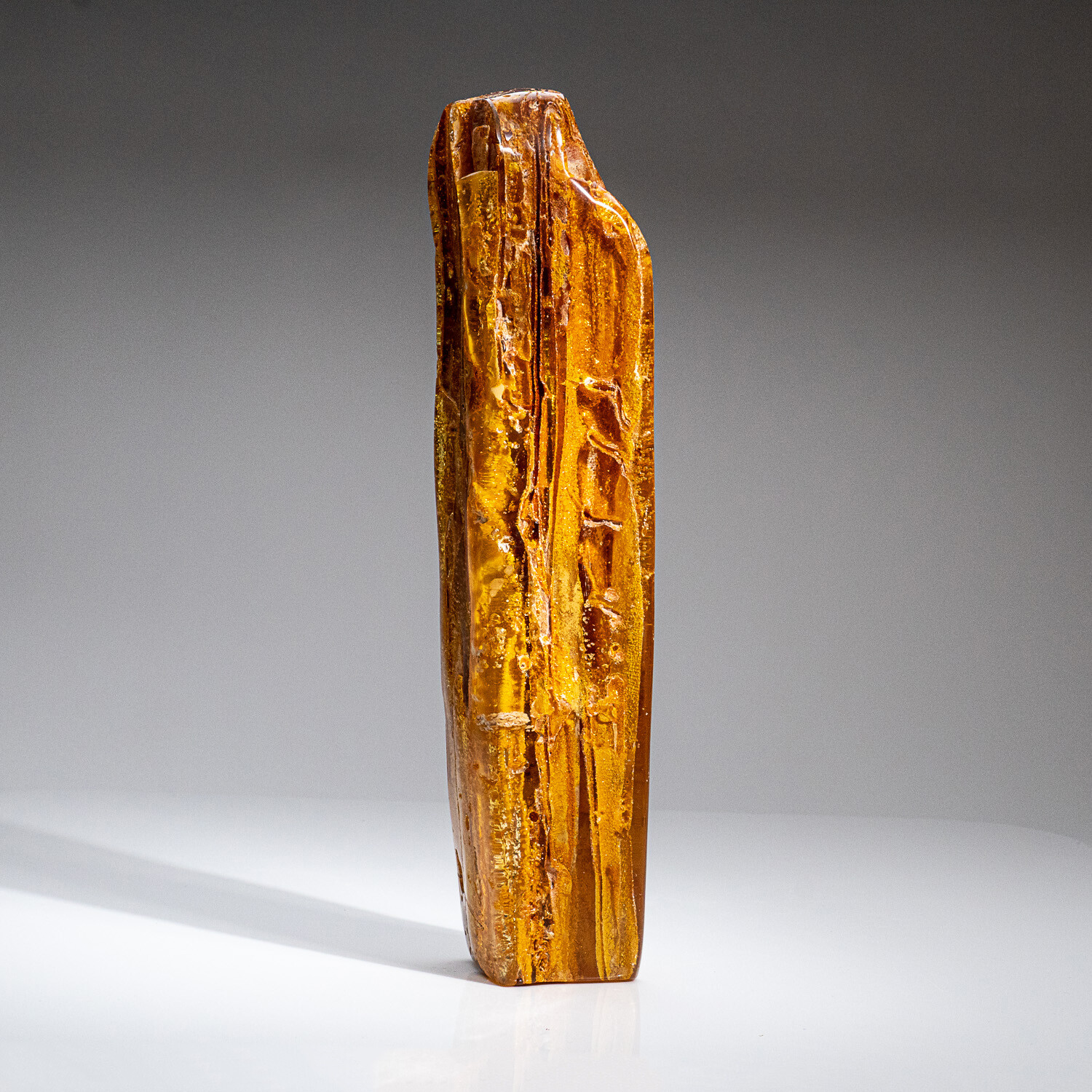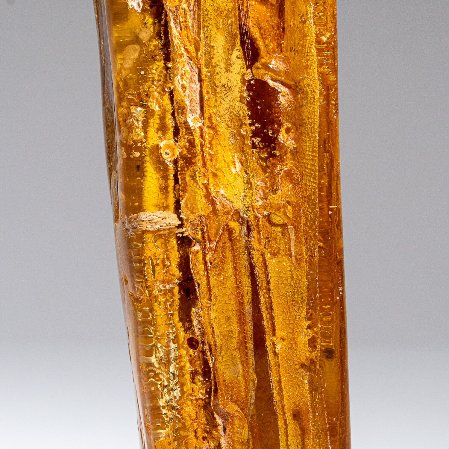 This transparent specimen of natural Colombian amber is polished to highlight its interior clarity and comprises some of the finest quality amber globally. Amber is prehistoric tree sap that has been fossilized. This solid specimen displays beautiful cognac-orange coloring, as well as some organic material. Additionally, its hard texture renders it robust and therefore optimal for carving and wearing as jewelry. Amber helps remove energy blockage, strengthens physical body.