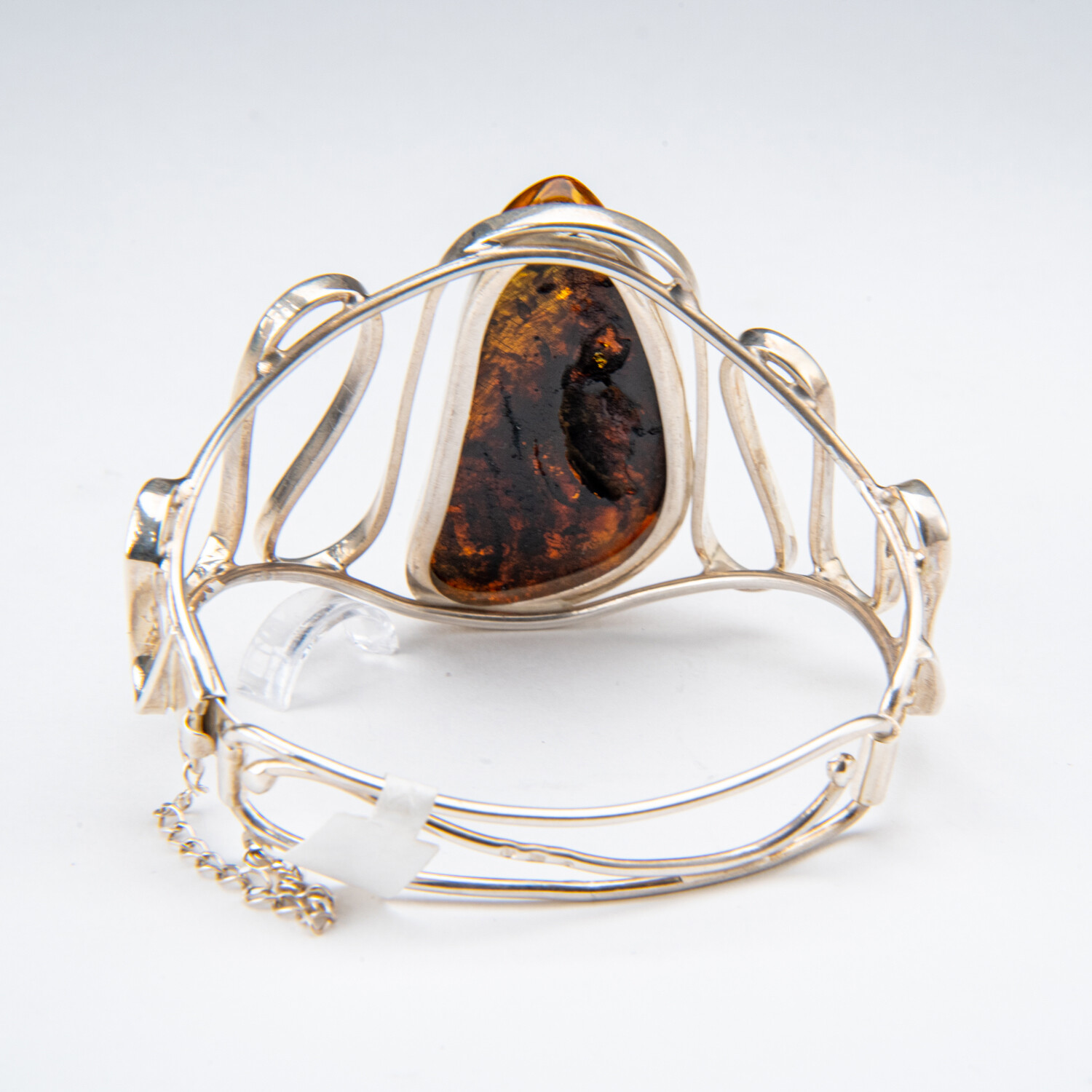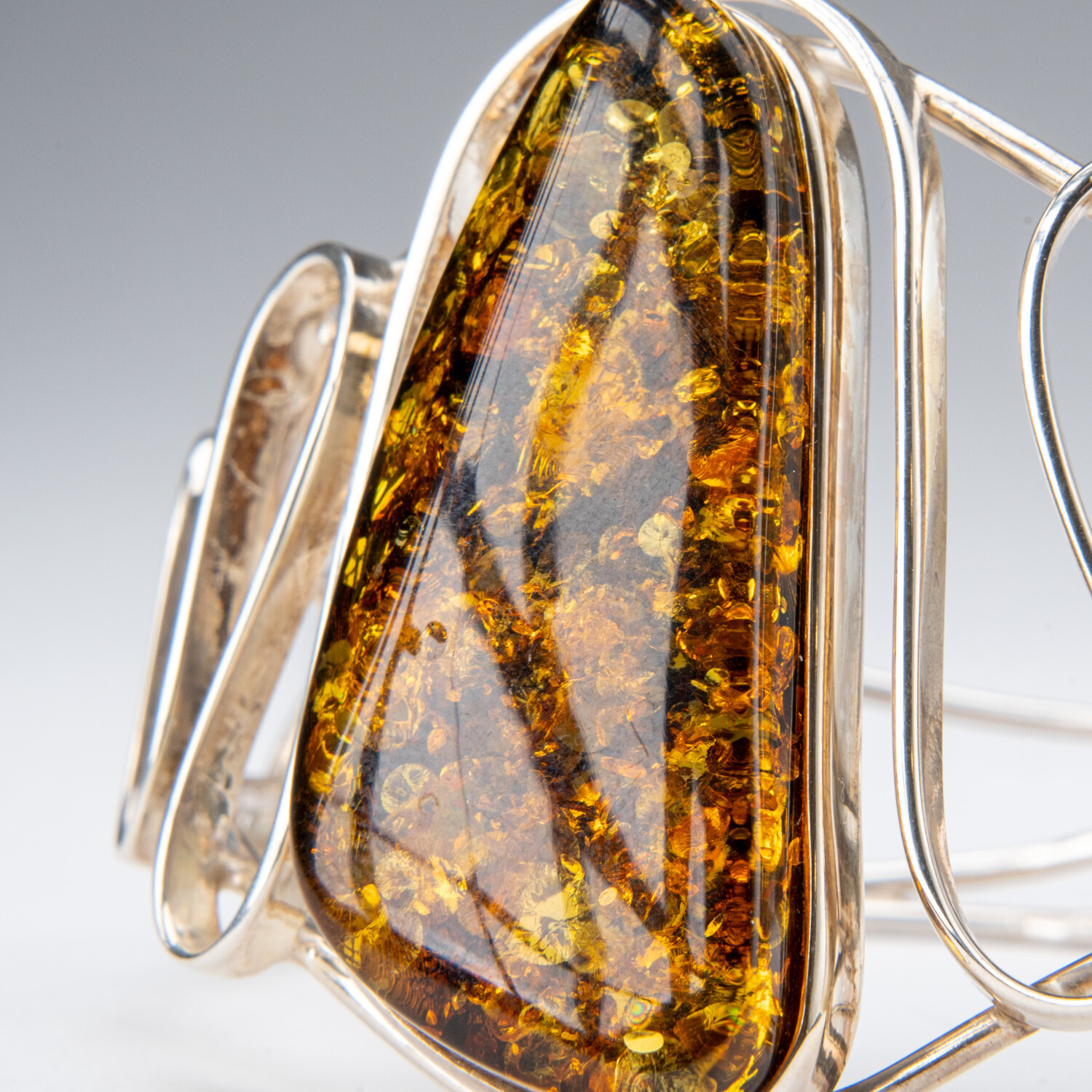 This Genuine Sterling Silver and Golden Amber Bangle Bracelet features a gorgeous dark honey amber freeform in the center and hand crafted in sterling silver. The bracelet size is approx 2.5" diameter. Center stone is approx 2" x 1". This piece comes with a black velvet bag. Amber is fossilized tree sap that dates back 40 million years. This specimen was sourced from the Baltic Sea - which contains some of the highest quality and richest deposits found. This piece was handmade in Gdansk, Poland and comes with a certificate of authenticity. Amber helps remove energy blockages and strengthens the physical body.