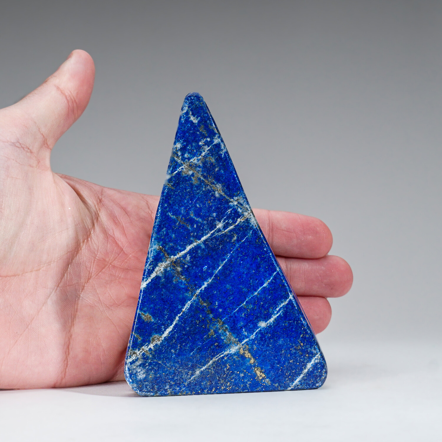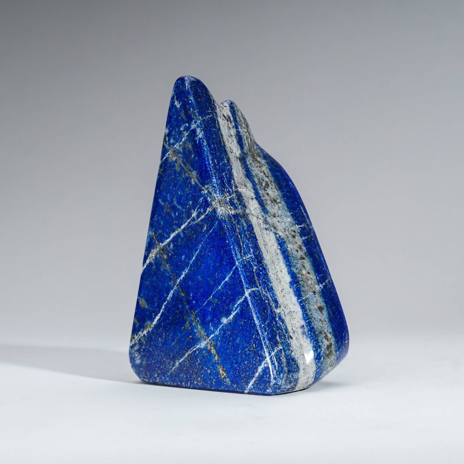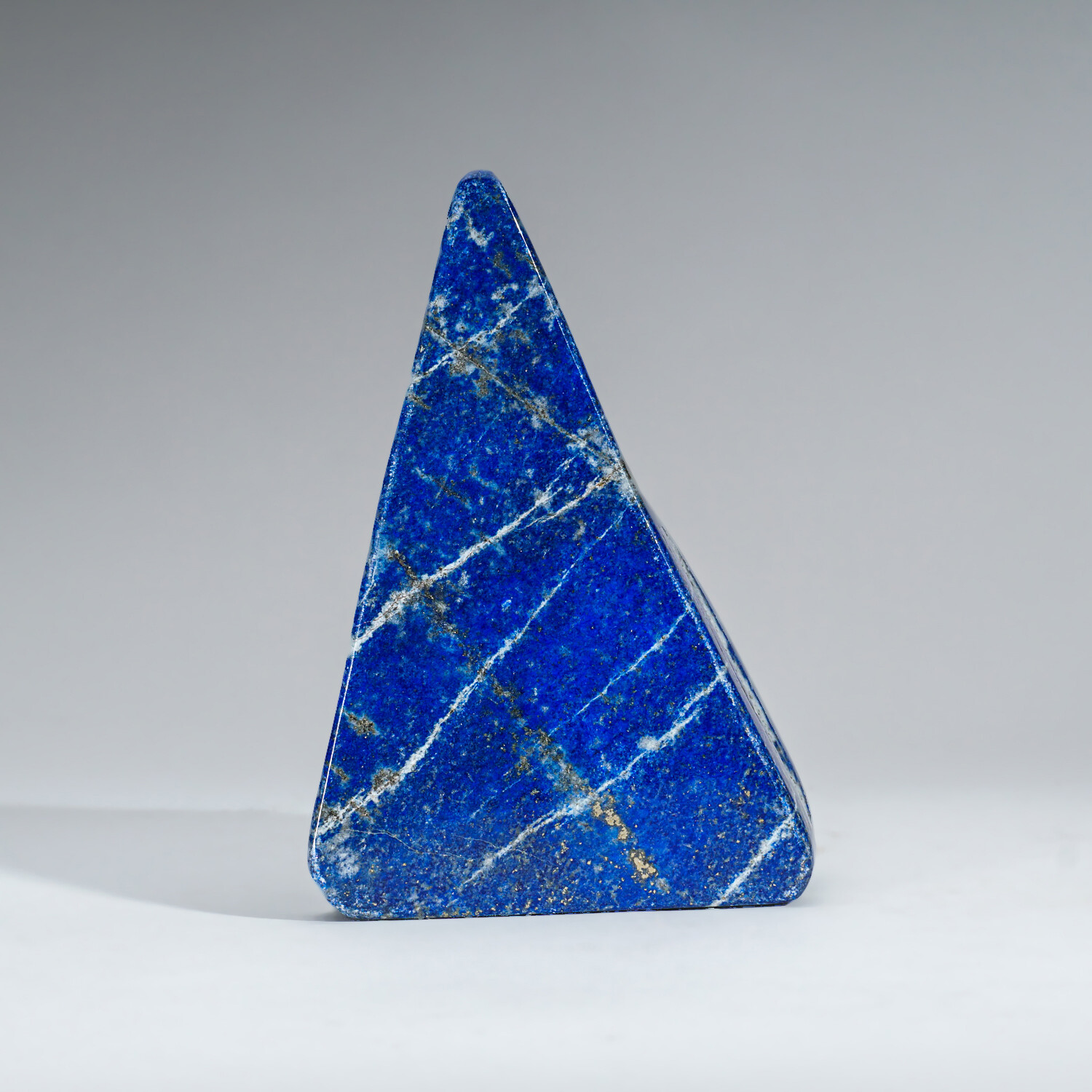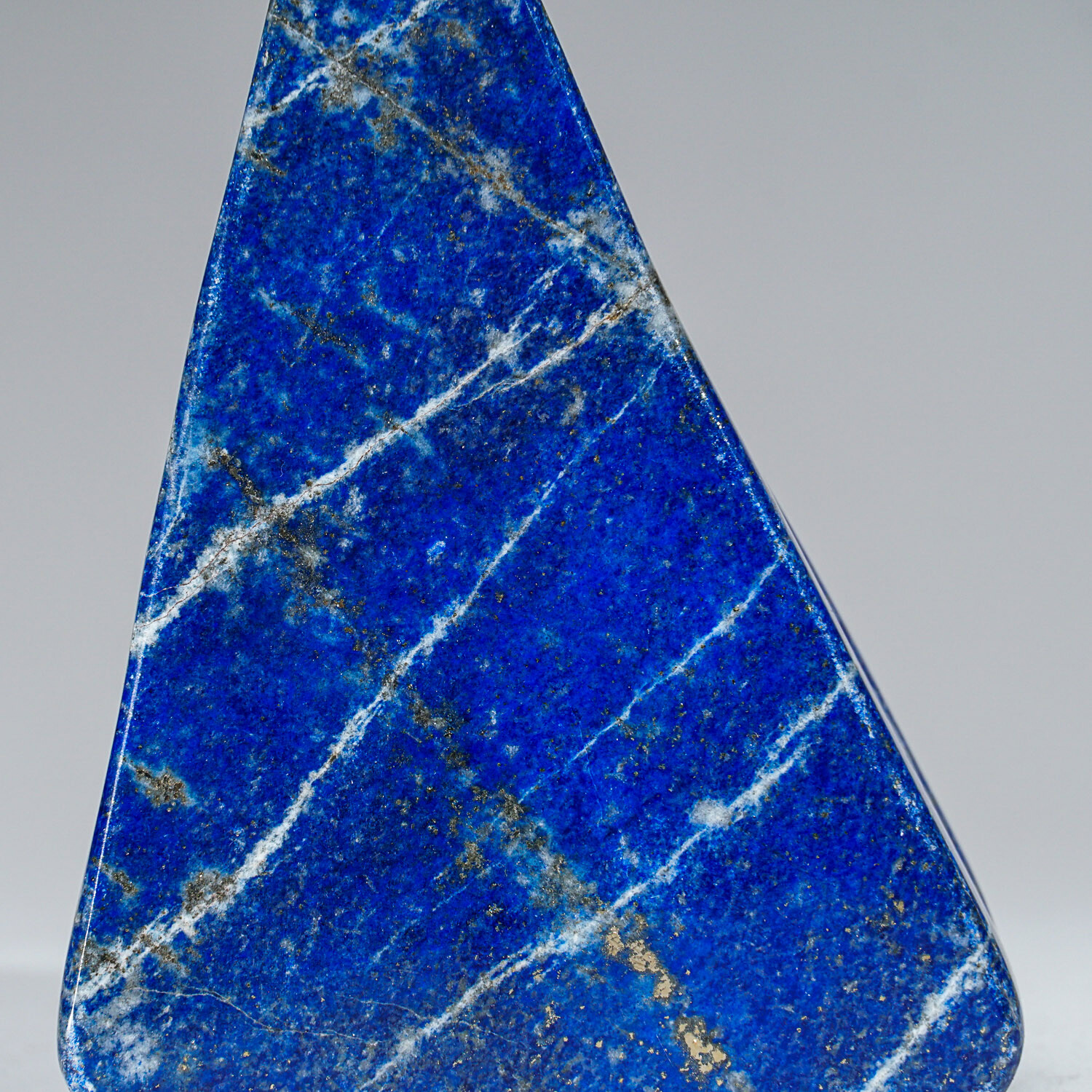 This gem-quality freeform is carved from natural, solid, Lapis Lazuli. This piece is highly saturated with royal blue coloring and attractive pyrite microcrystals. Lapis lazuli is an aggregate of several minerals. Lazurite grains provide its characteristic color. The higher the percentage of lazurite grains in the aggregate, the darker the blue color. This freeform is an exceptional example of this, as it has a smoothly uniform body color.