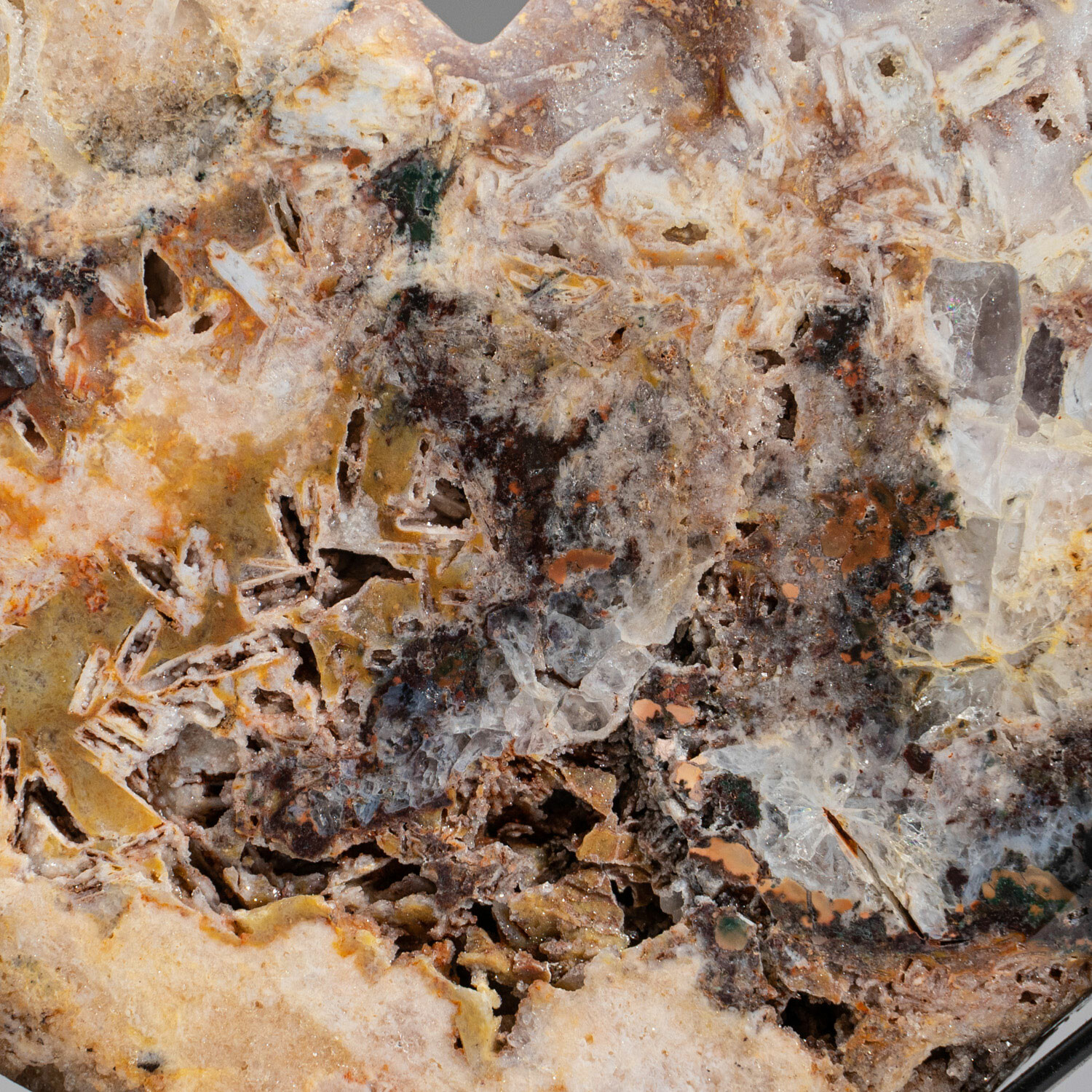 This is a beautiful Brazilian Crazy Lace Agate Heart with a unique and definitive pattern. Both sides have been polished to a mirror finish revealing earthy tones of black, tan, and light pink. This piece is mounted on a custom black metal display stand. Agates are grounding stones, bringing about an emotional physical and intellectual balance. They aid in centering and stabilizing physical energy.