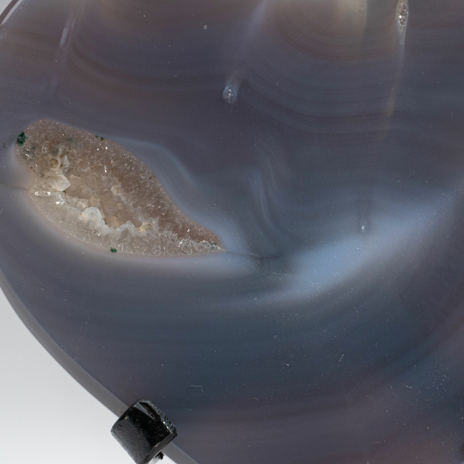 This is a Polished Blue Agate Heart in which both side has been polished to a mirror finish revealing colorful bands of dark blue, white and grey tones. This piece is mounted on a custom black metal display stand. Agates are grounding stones, bringing about an emotional physical and intellectual balance. They aid in centering and stabilizing physical energy.
