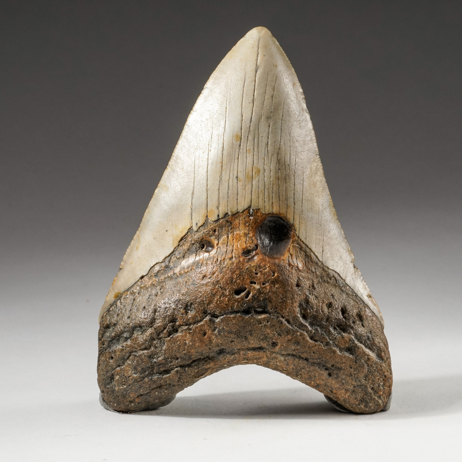 This specimen is a large, well preserved, genuine Megalodon shark tooth. These teeth are found by scuba divers off of the coasts of North and South Carolina. Megalodon was a prehistoric shark that may have been 40 feet (12m) long or more. There are a few scientists who estimate it could have been up to 50 to 100 feet long -15.5 to 31m long.