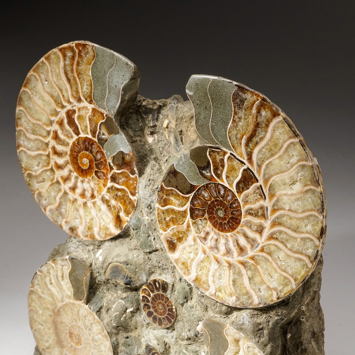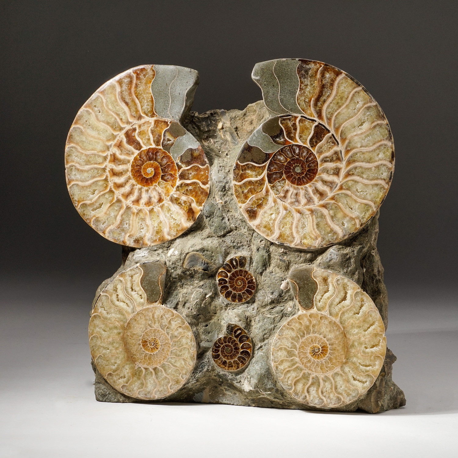 This museum-quality calcified cleaniceras ammonite cluster from Madagascar comes from the Cretaceous period. It is a free-standing cluster with four ammonite halves, making for easy display.