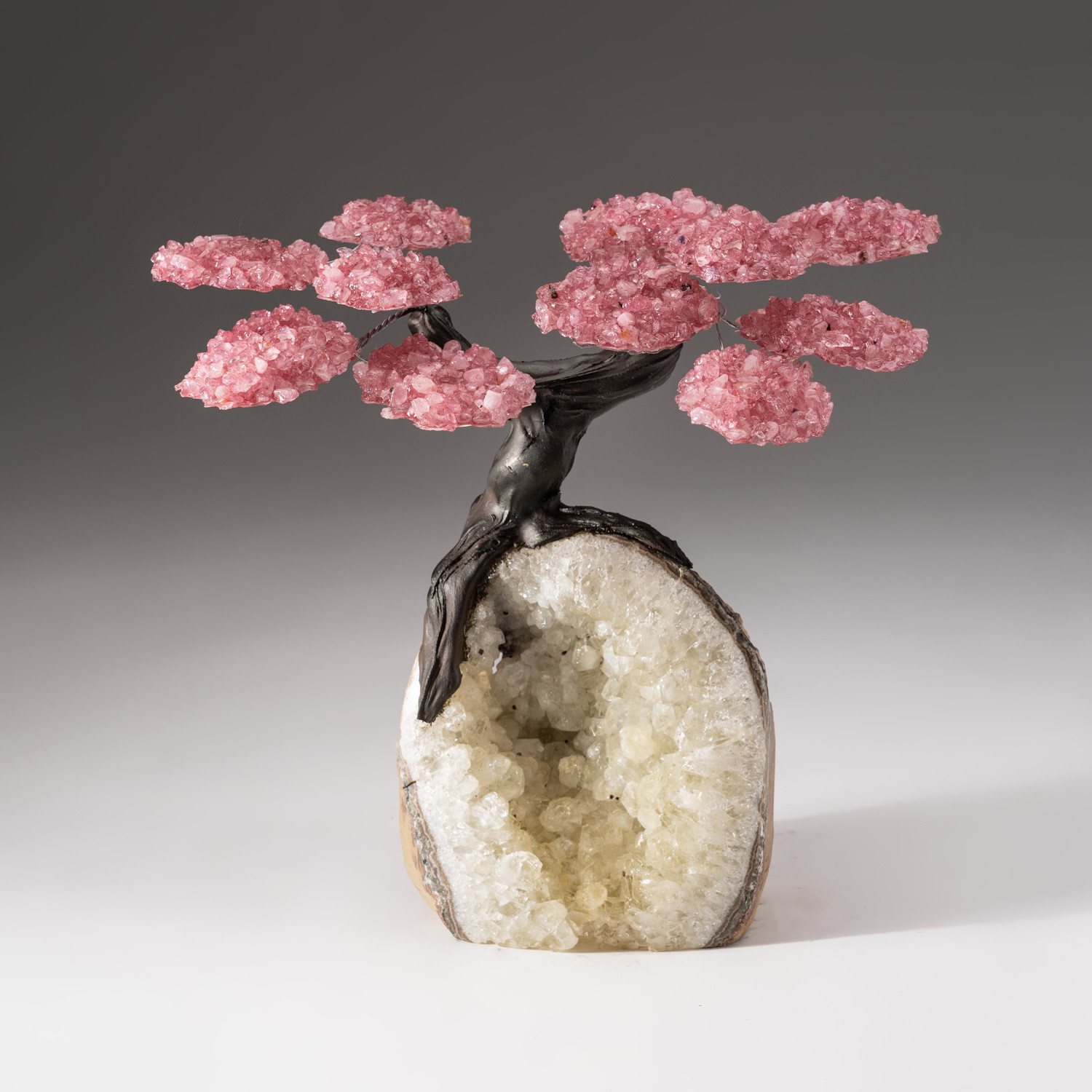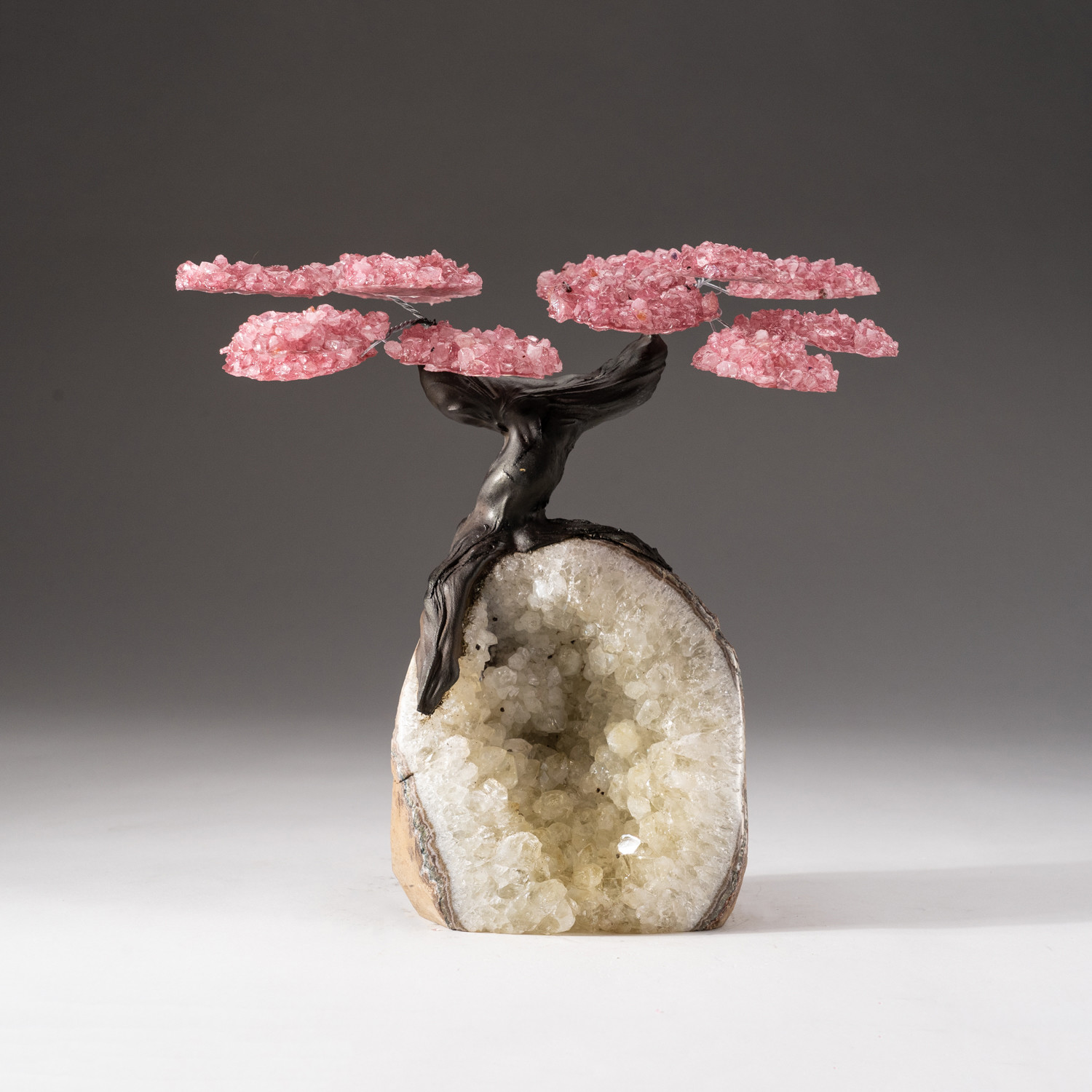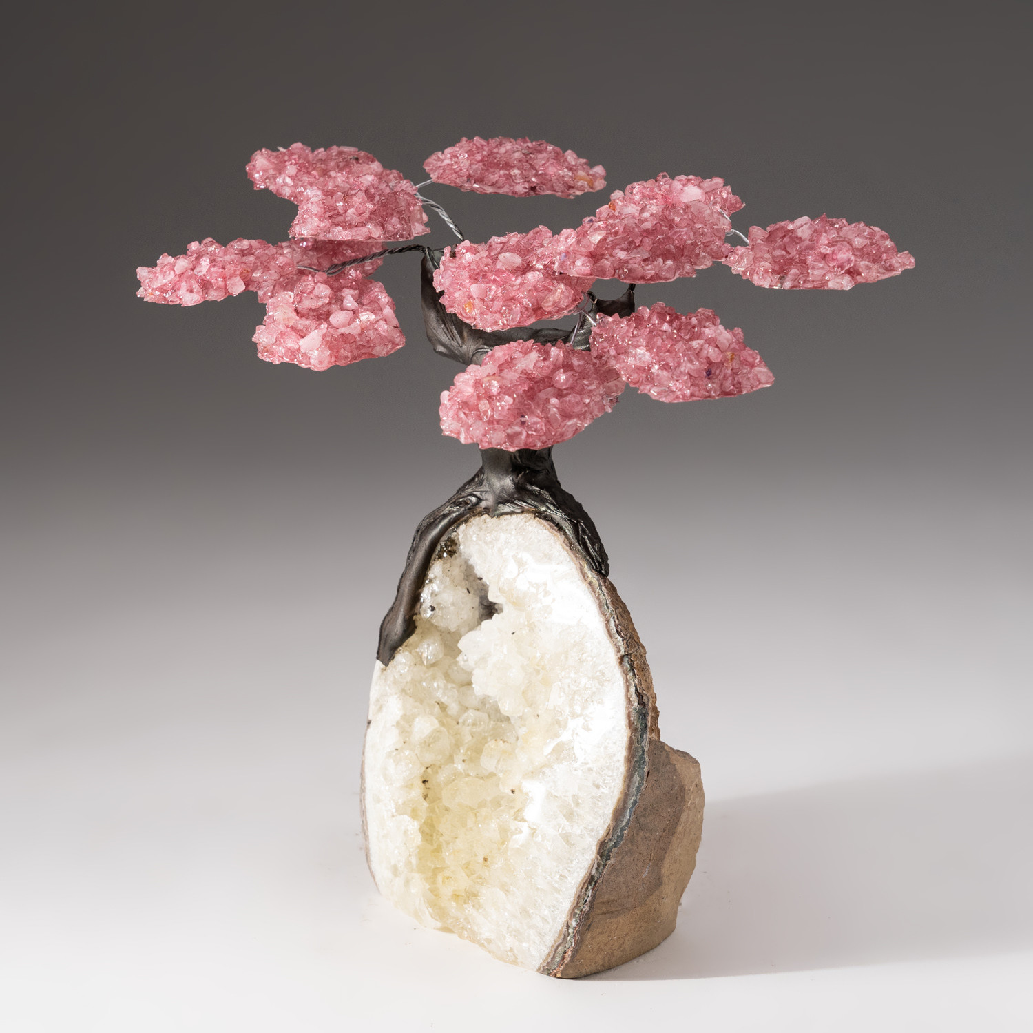 The Wellness Tree is a genuine Rose Quartz clustered gemstone tree with faux tree trunk set on a Quartz crystal matrix. Individually handcrafted, this stunning art piece adds natural beauty to any space.