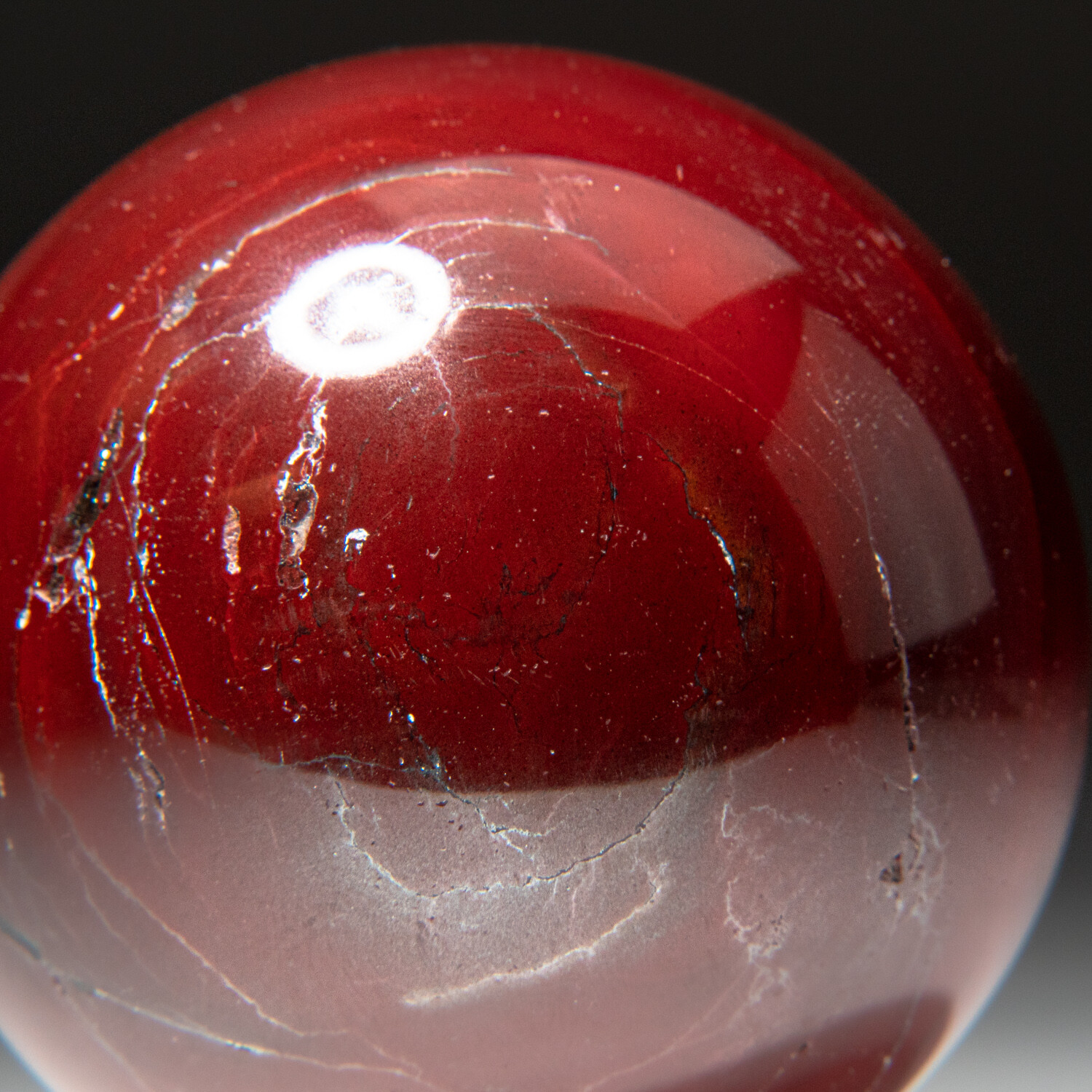This top-quality Carnelian sphere from Madagascar is a beautiful piece with a deep, rich red color hand-polished to a smooth, highly reflective surface.