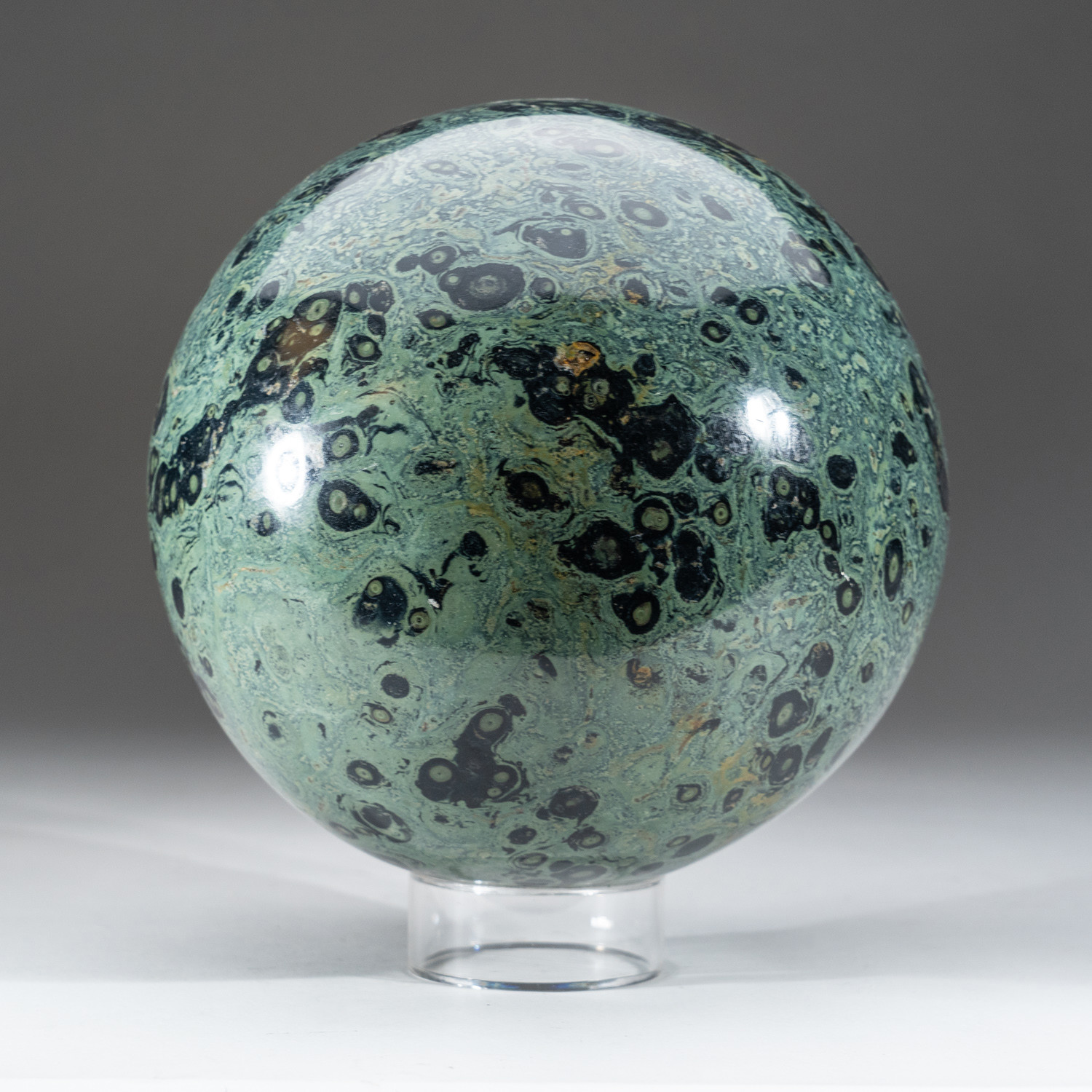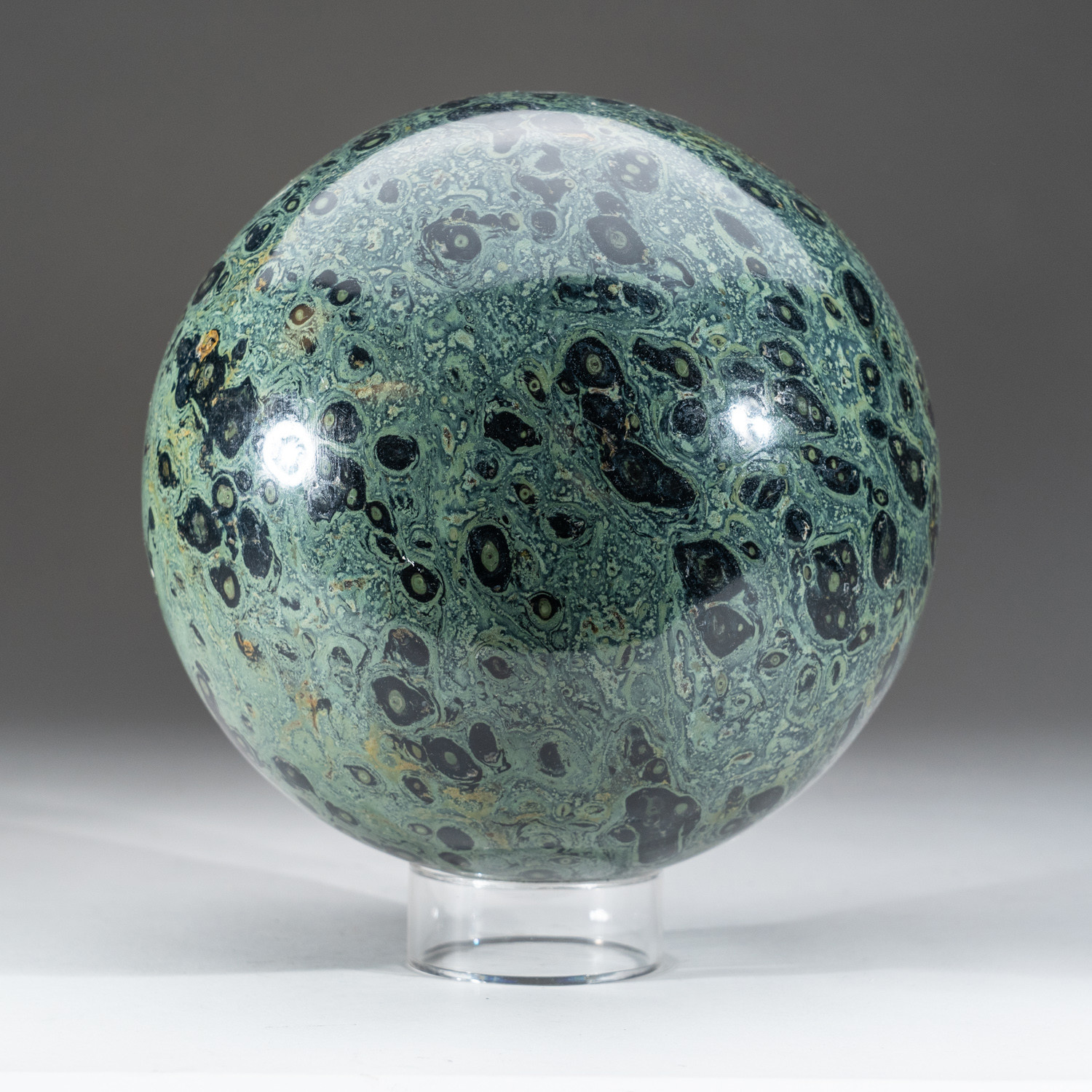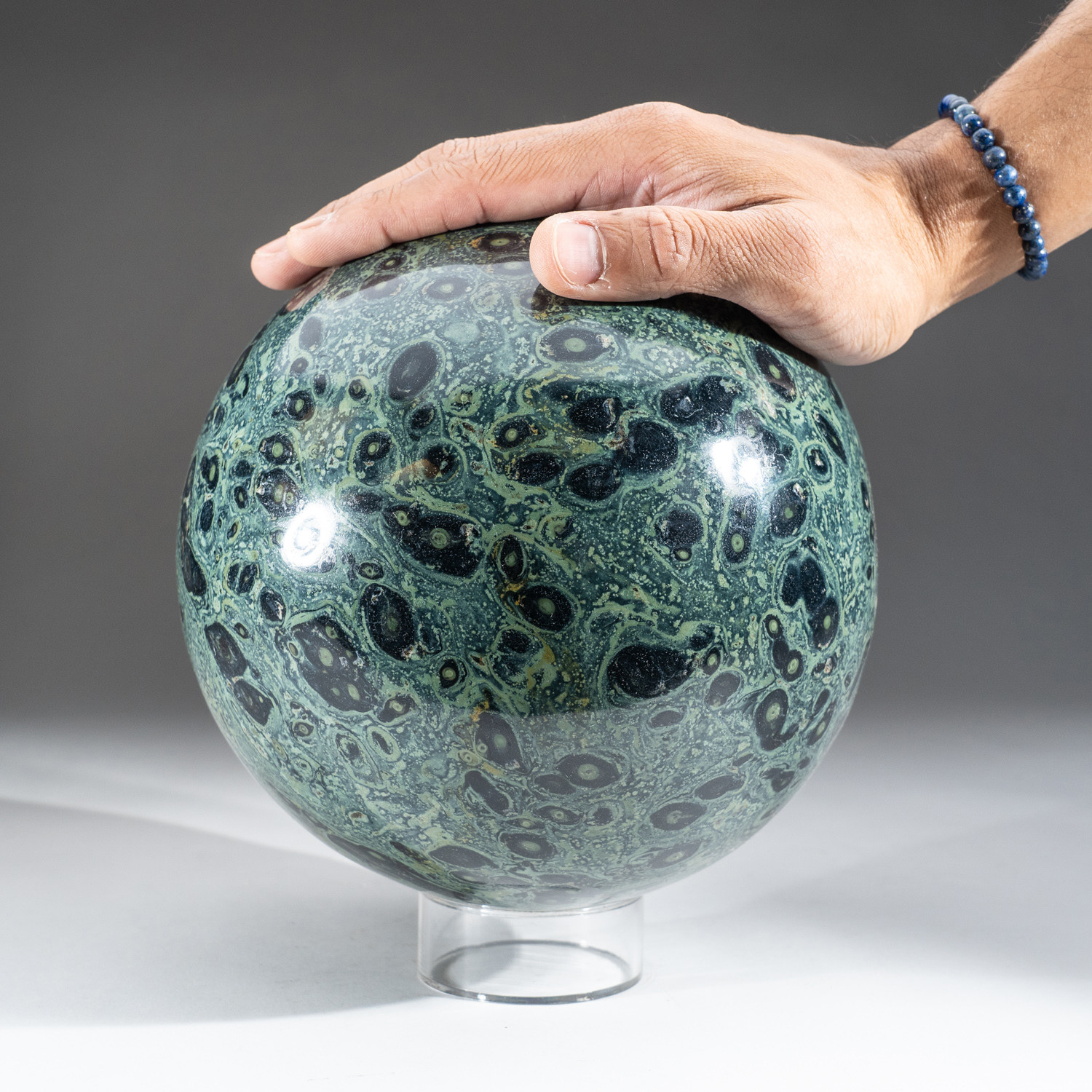 A large, beautiful handmade Kambaba Jasper sphere hand polished from a solid, single piece of Kambaba. This piece has excellent shine, and an amazing pattern with dark mystic circles and deep green swirls