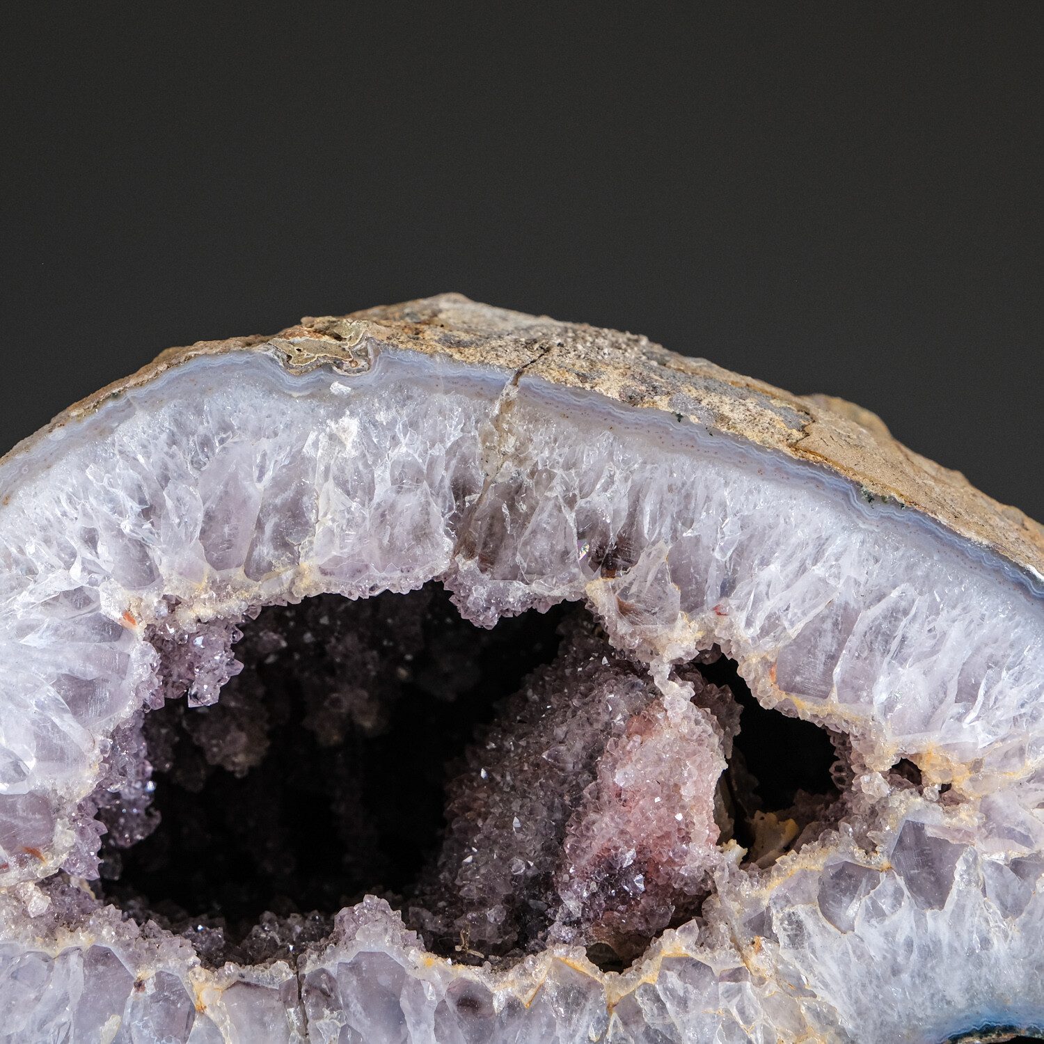 Beautiful and colorful geode of banded agate with geode cavity lined with lustrous druzy quartz crystals. Front faces has been polished to a mirror finish. From Brazil. Agates are grounding stones, bringing about an emotional physical and intellectual balance. They aid in centering and stabilizing physical energy. You will receive the exact object in these photos