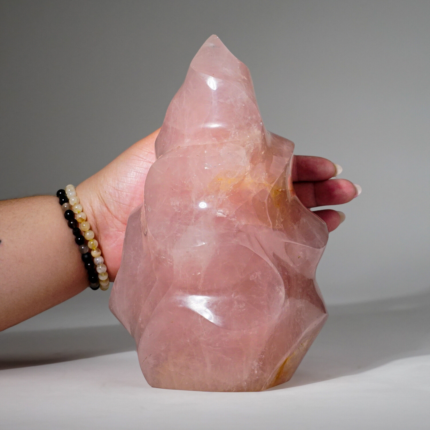 Magnificent quality, hand-polished flame free-form of natural gem translucent rose quartz from Brazil. This specimen has bright rich color, all sides hand polished to a smooth mirror finish. Rose Quartz is the stone of unconditional love. One of the most important stones for Heart Chakra work, Rose Quartz opens the heart to all types of love - love of self, love of family, love of friends, romantic love. You will receive the exact object in these photos.