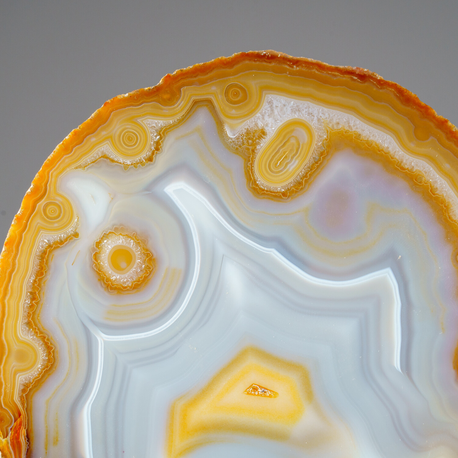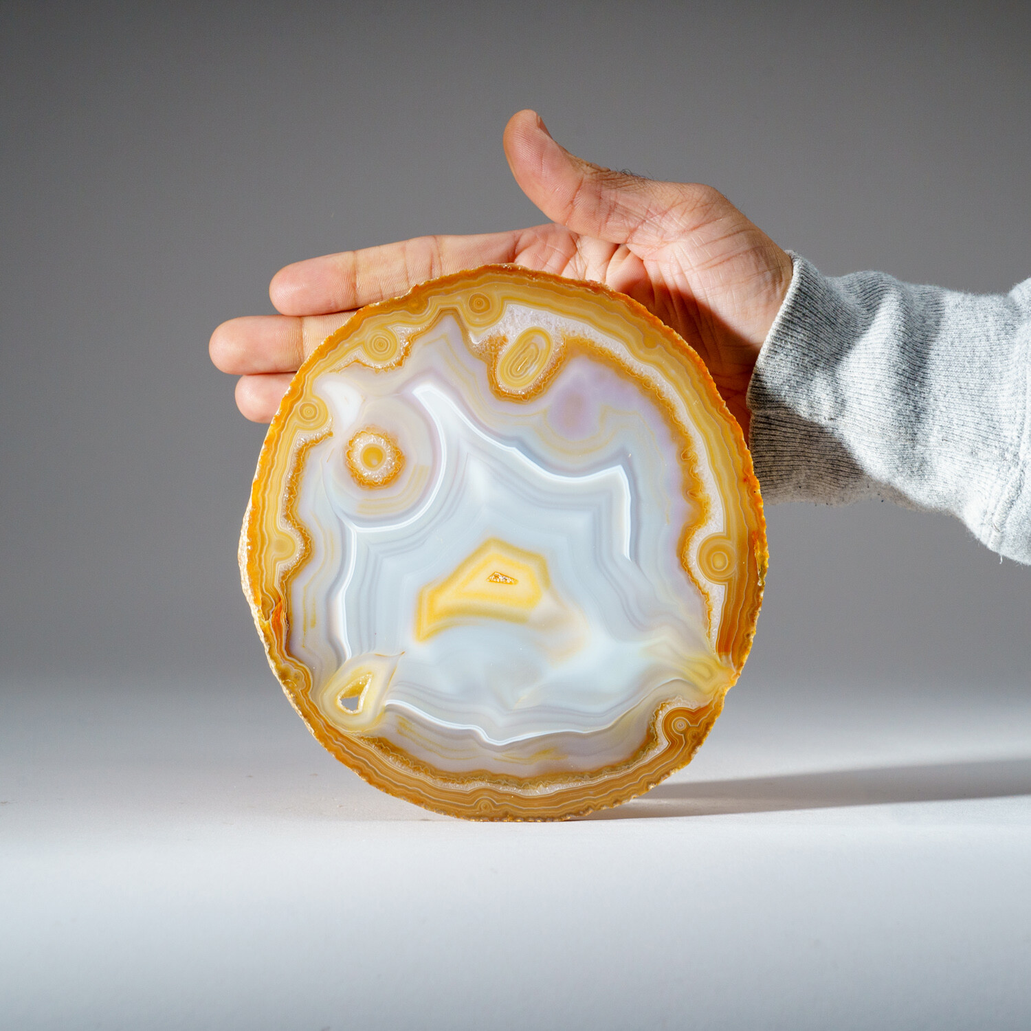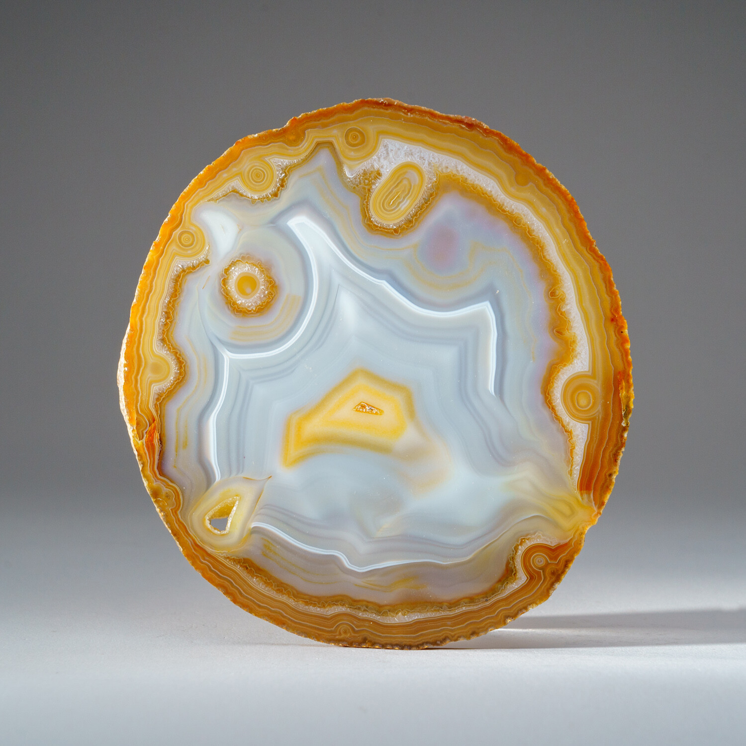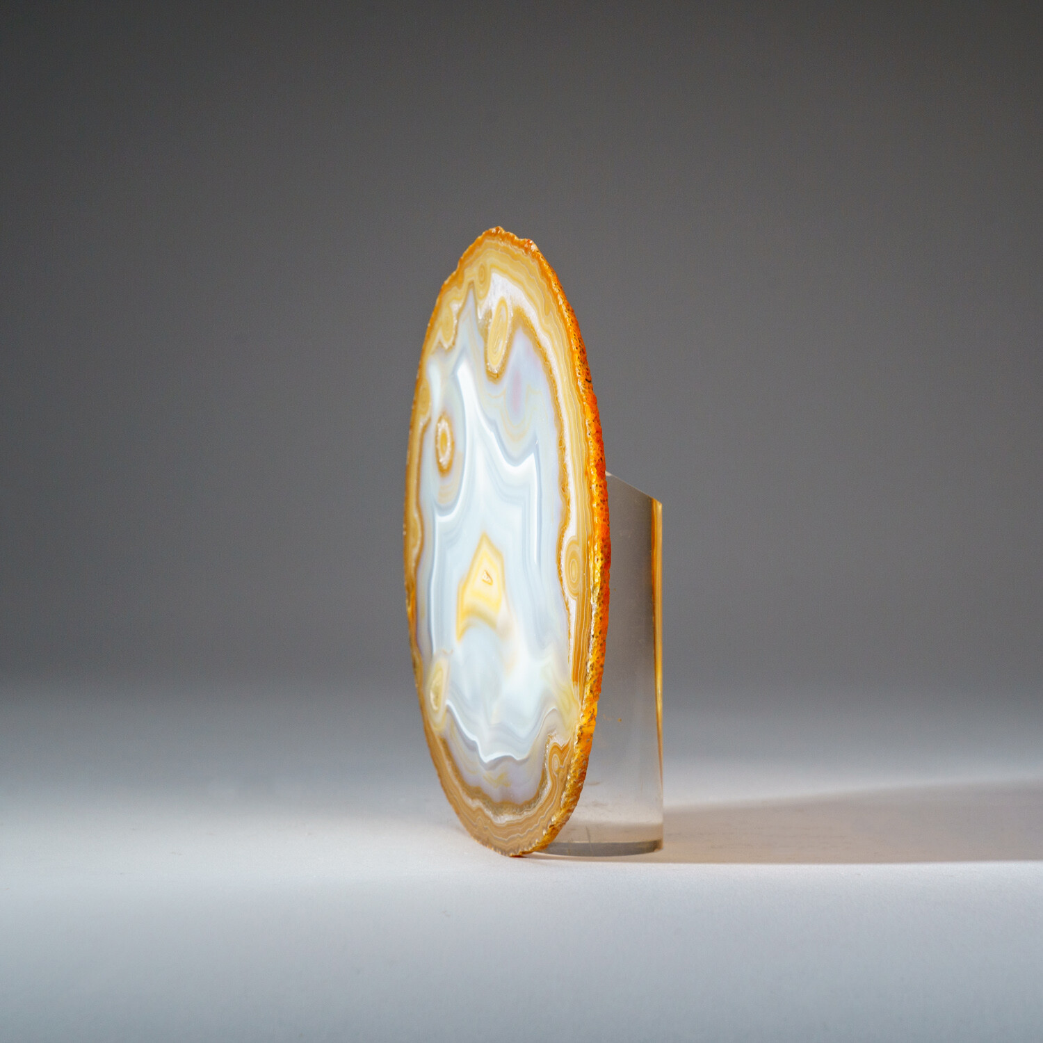 Beautiful Brazilian natural banded agate freeform slice with acrylic display stand. This piece is polished on both sides, untreated and displays beautiful natural wavy patterns - that look like a "smiley face". This beautiful specimen ranges in all earth tone colors - yellow, brown and white. Agates are grounding stones, bringing about an emotional physical and intellectual balance. They aid in centering and stabilizing physical energy. You will receive the exact object in these photos.