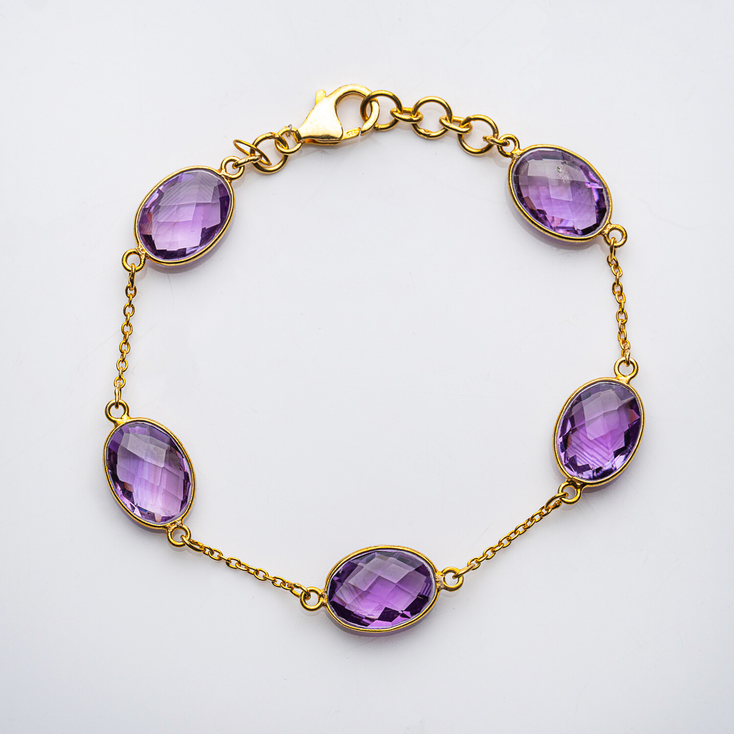 Genuine Faceted Amethyst Gemstone Bracelet, Set In Sterling Silver // 14K Gold Wash