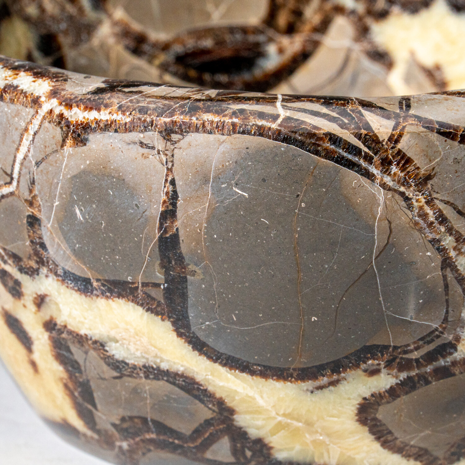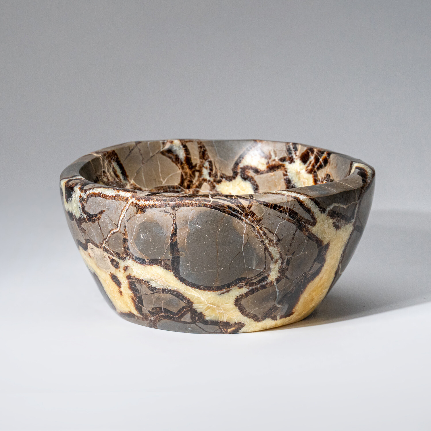 This one-of-a-kind polished bowl is crafted from a solid piece of natural Septarian and is sourced from Madagascar. It has a great mix of yellow calcite and brown Aragonite, in a very cool design.