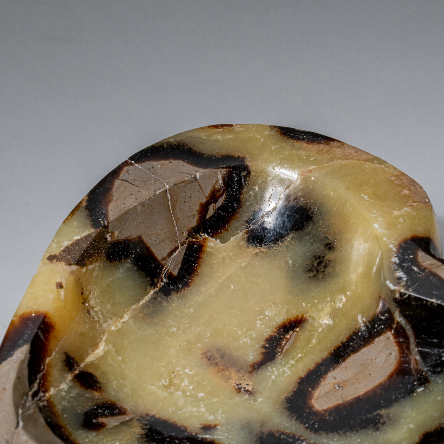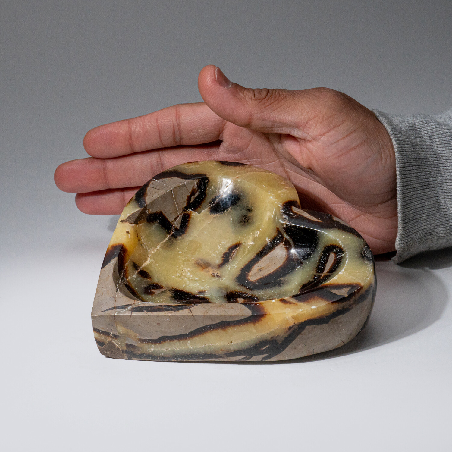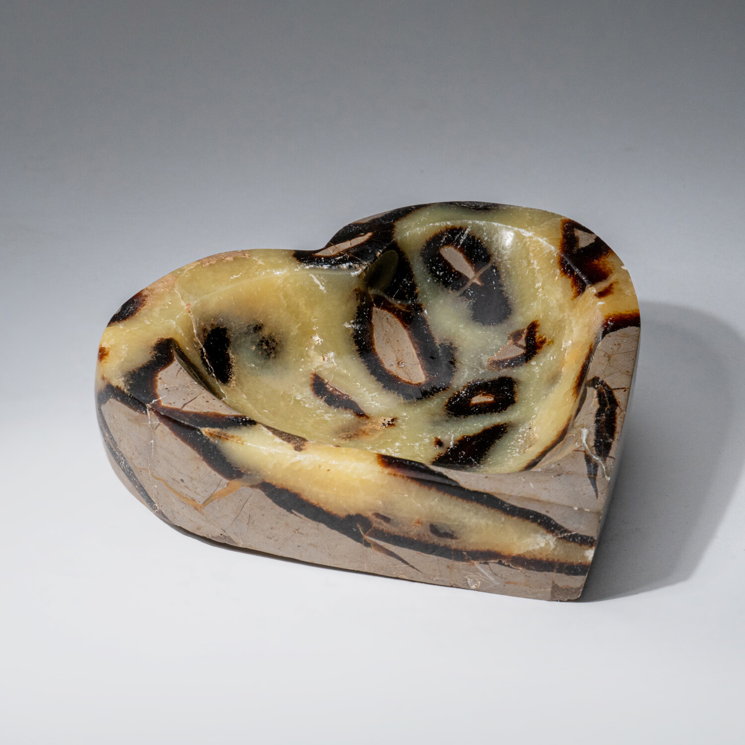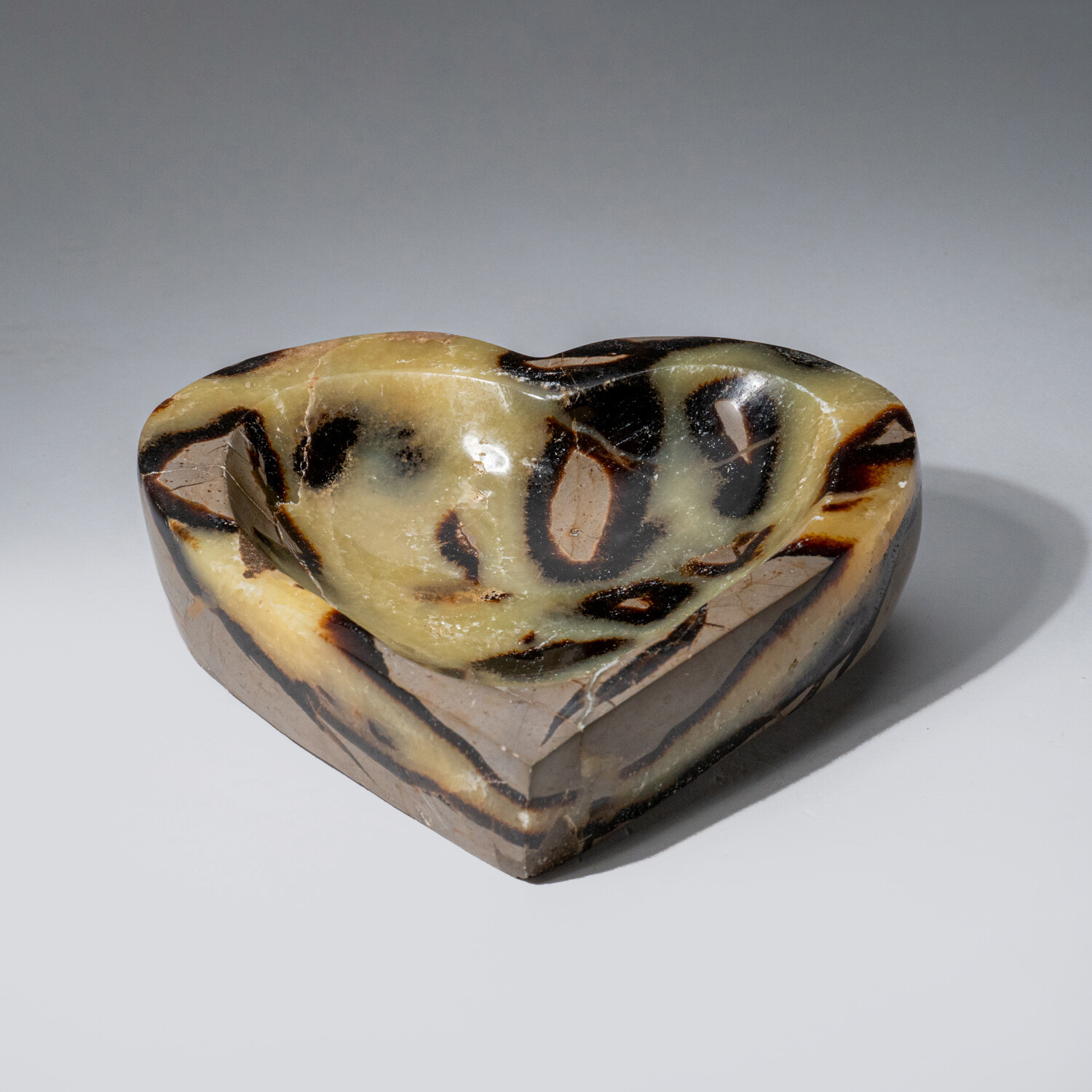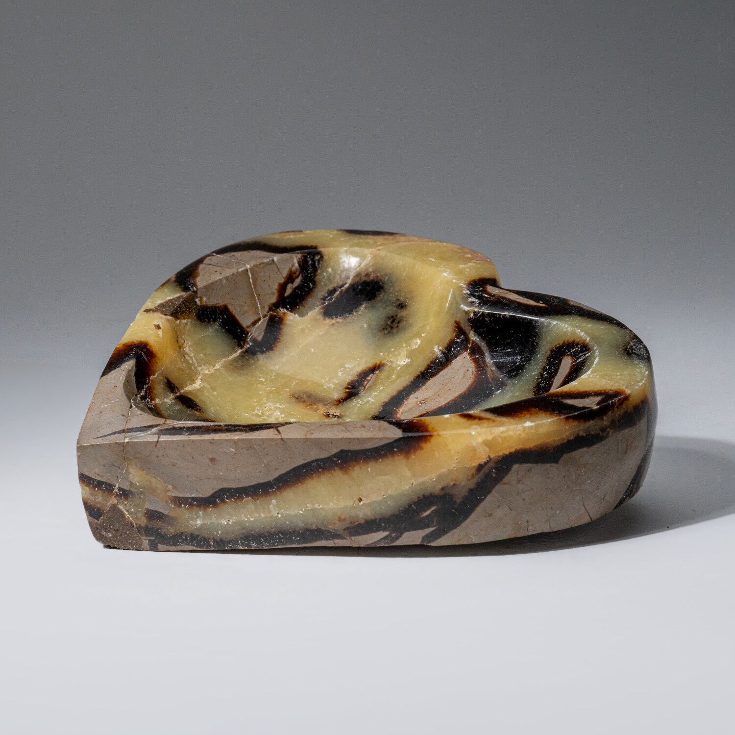 This one-of-a-kind polished heart shaped bowl is crafted from a solid piece of natural Septarian and is sourced from Madagascar. It has a great mix of yellow calcite and brown Aragonite, in a very cool design.