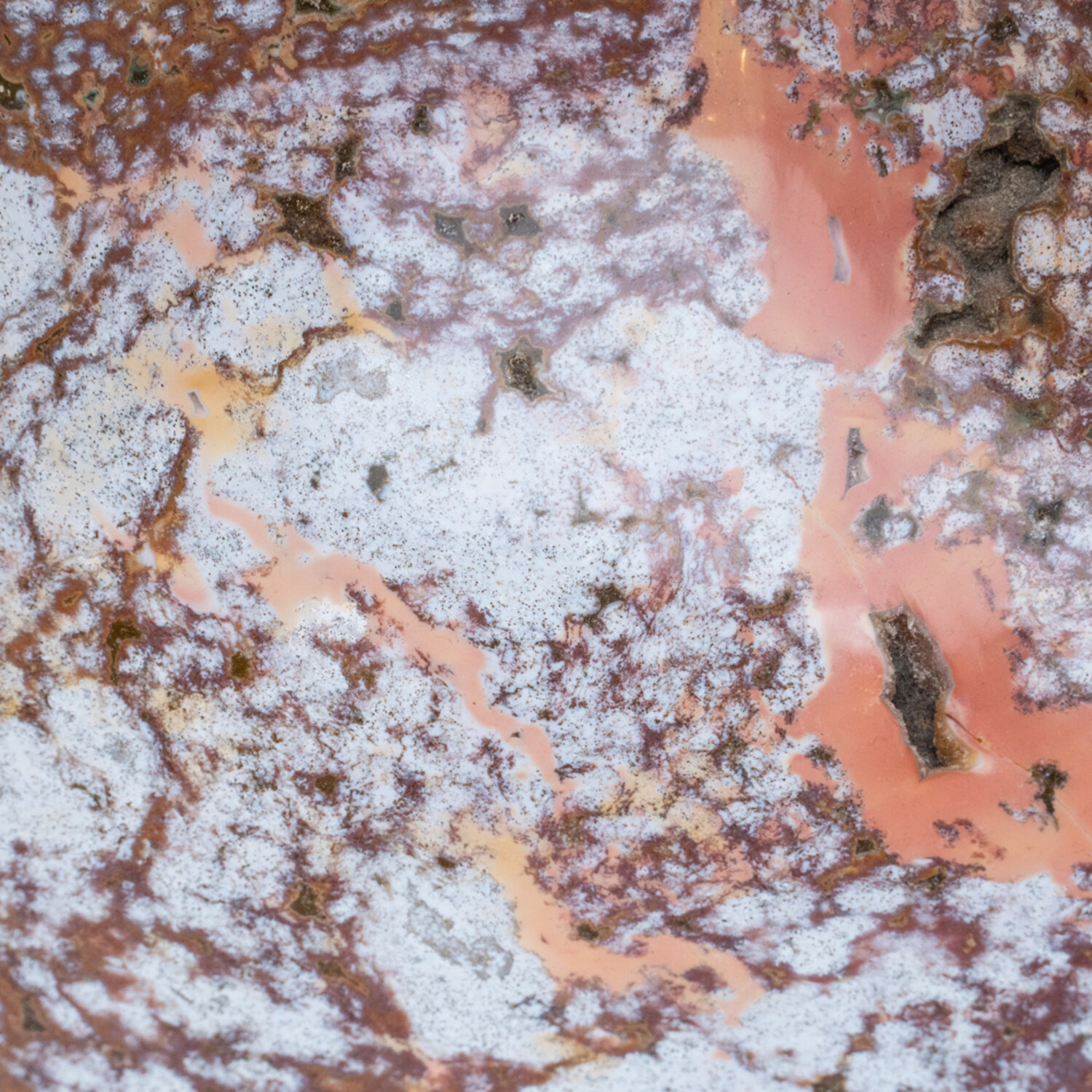 This one-of-a-kind freeform bowl is crafted from a solid piece of natural Ocean Jasper from Madagascar. This piece is hand-polished to a mirrored finish and has a sophisticated appeal. Ocean Jasper often includes "vugs" lined with white or green druzy quartz crystals. It is found in only one place in the world - along the rugged northeast coast of Madagascar. This will make a beautiful centerpiece to complement your home and is a perfect accent into any interior.