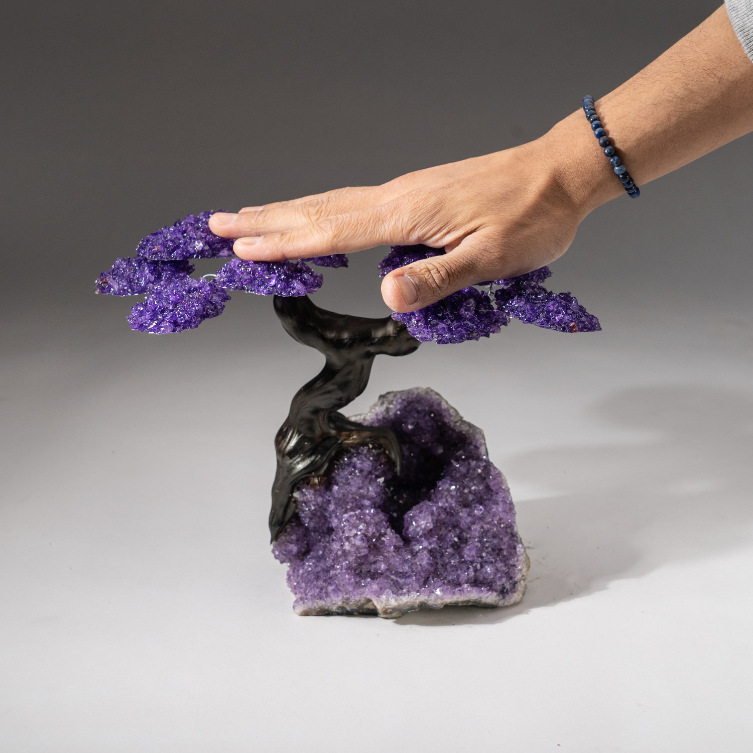 The Protection Tree is a genuine Amethyst clustered gemstone tree with a faux tree trunk set on a large Amethyst crystal cluster on matrix. Handmade by Brazilian artisans, each tree has been individually handcrafted and hand painted, making each one unique. The Protection Tree makes for a great gift and beautiful display piece in any room.