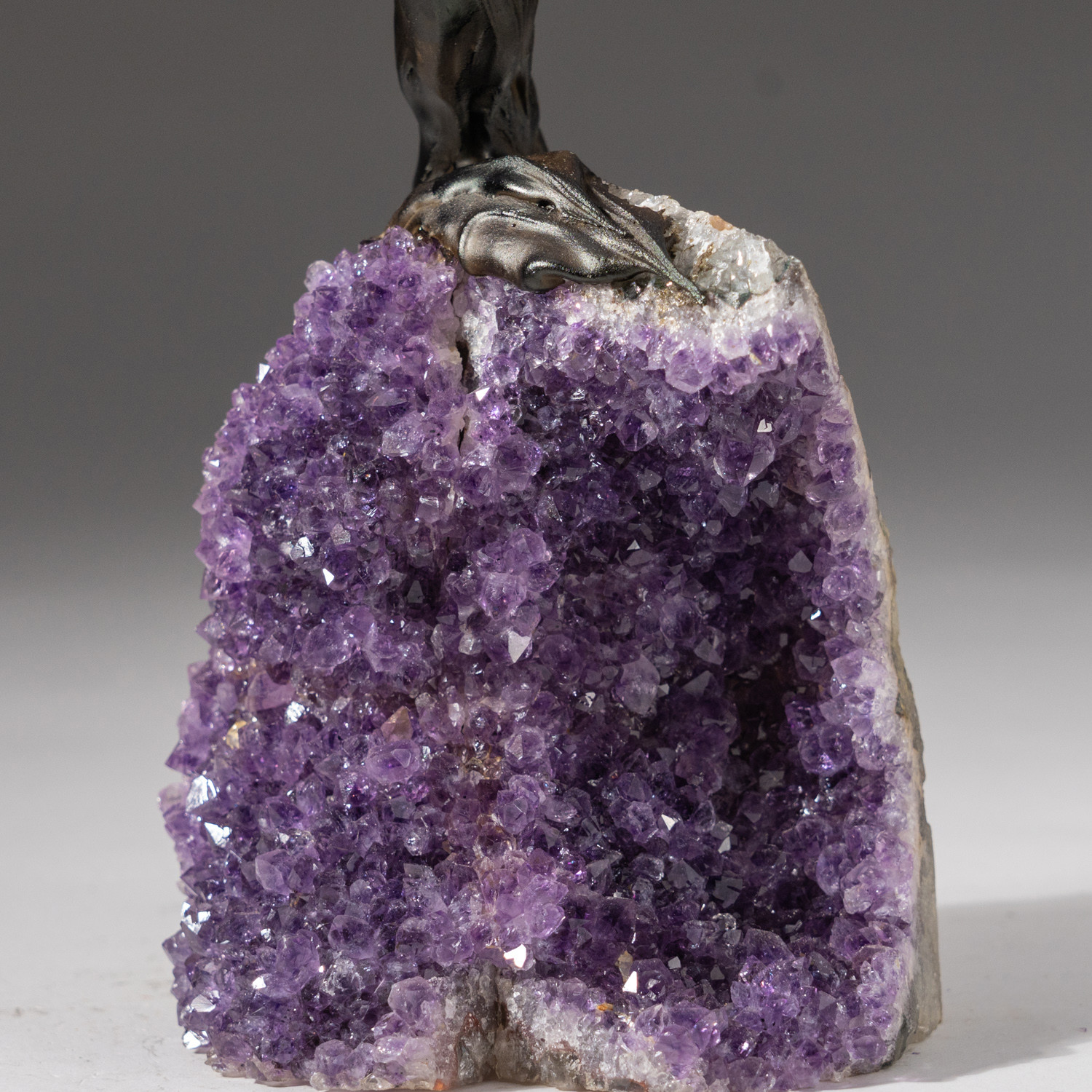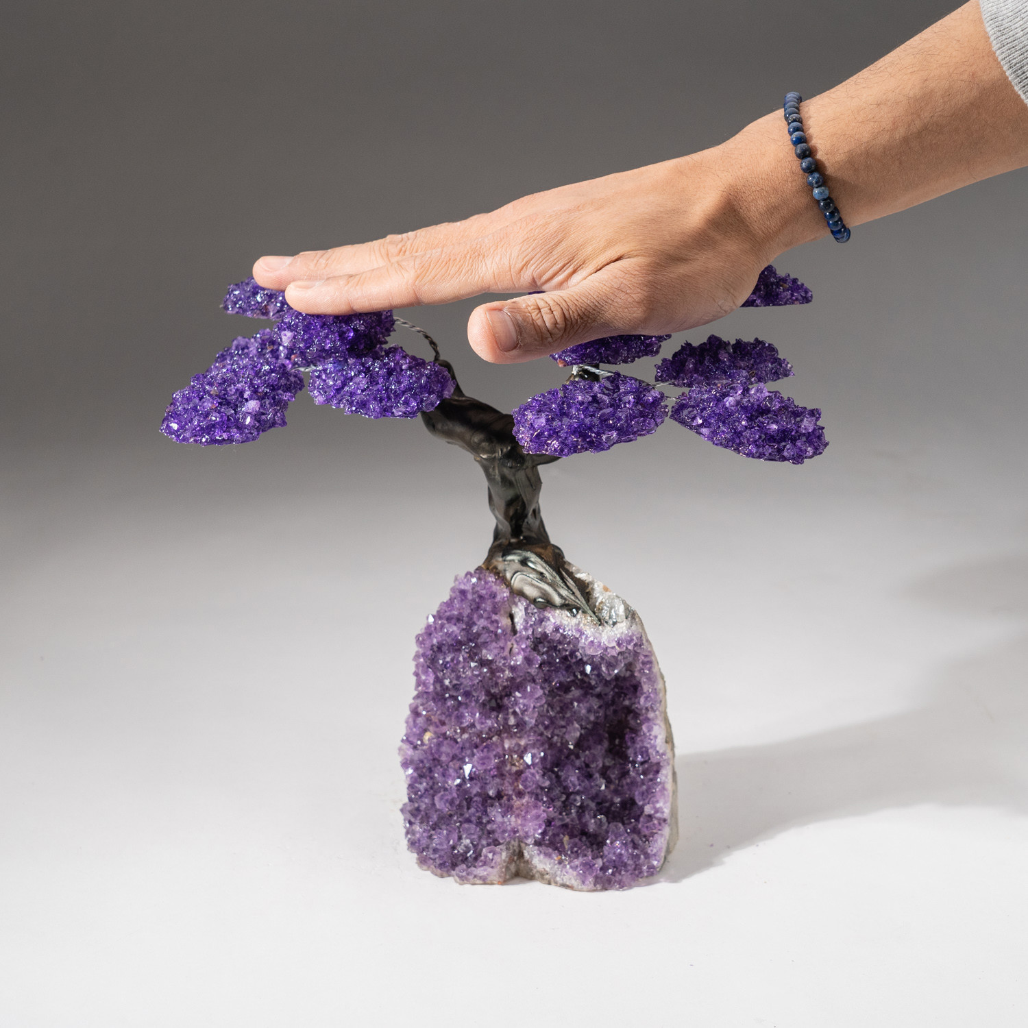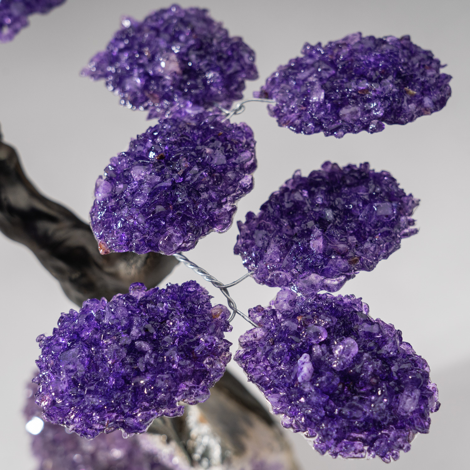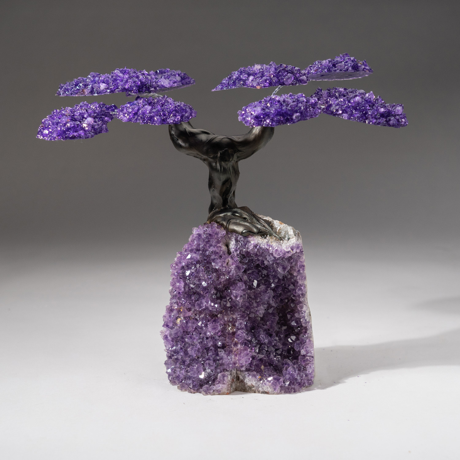 The Protection Tree is a genuine Amethyst clustered gemstone tree with a faux tree trunk set on a large Amethyst crystal cluster on matrix. Handmade by Brazilian artisans, each tree has been individually handcrafted and hand painted, making each one unique. The Protection Tree makes for a great gift and beautiful display piece in any room.
