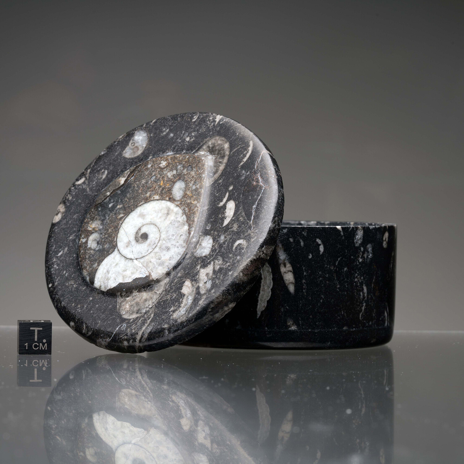 This beautiful hand-carved ammonite and belemnite circular container – perfect for storing precious items like jewelry – is from the Atlas Mountains in South Morocco. Ammonites and belemnites are extinct species of orthoceras, an ancient relative to the modern-day cephalopod—otherwise known as squids or nautilus. Ammonites and belemnites fossilize over a limestone bed and have an estimated age of about 370 million years, hailing from the Devonian period.