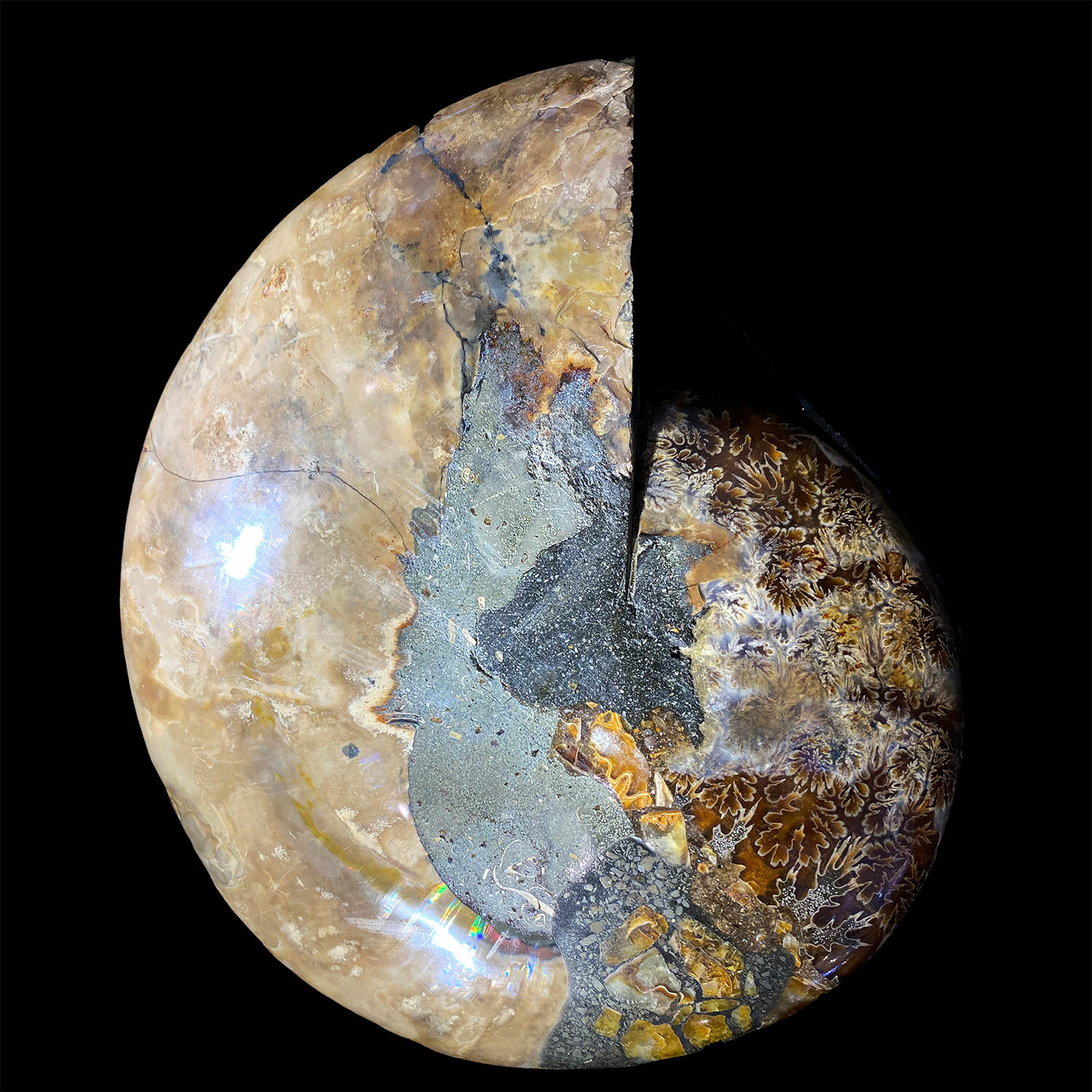 Ammonites range in age from 120 million years old to 165 million years old. This specimen has qualities that are very sought after by collectors: hollow chambers with calcite crystals forming on interior walls and some even filling the chamber completely. Minerals seeped into the ammonite’s shell and solidified, creating its ornate exterior which is iridescent in some places.
