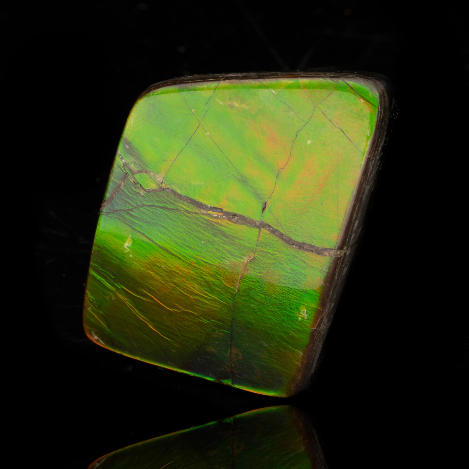 Ammolite only comes from one location – Alberta, Canada – and is one of a handful of biogenic (coming from life forms) gemstones. Ammolite is created when the mineral aragonite forms in thin, iridescent layers over the shells of extinct ammonites – a species of Orthoceras which can date back hundreds of millions of years. This hybrid gem-fossil is one of the most sought after materials for jewelry with stunning iridescense and incredibly broad range of color. This luminescent cobochon is an excellent acquisition for anyone who appreciates fossils and gemstones and who may want to design a one of a kind piece of jewelry for their collection.