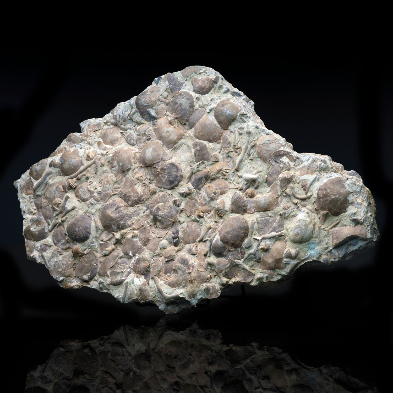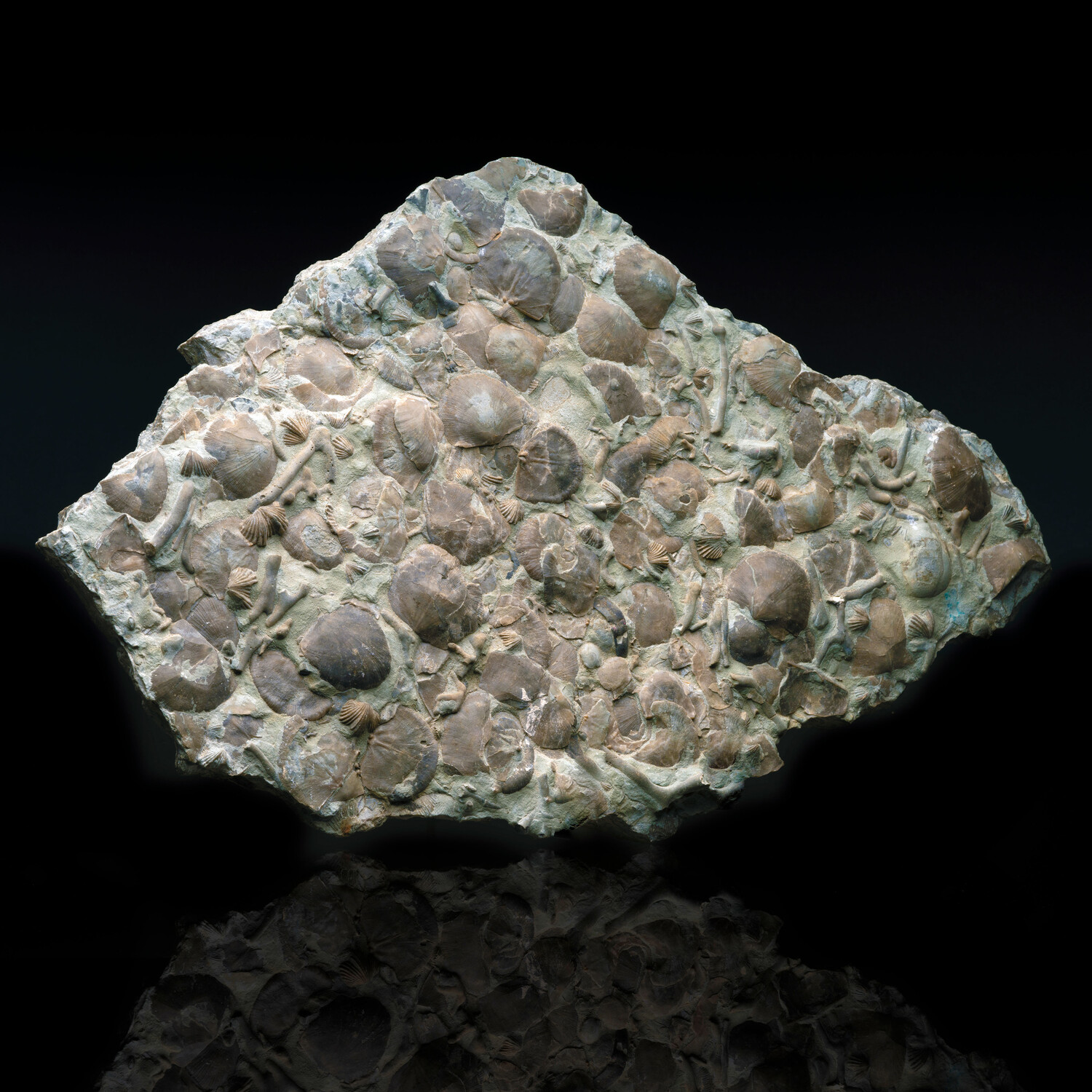 This large formation of brachiopod fossils in limestone – of the genus Rafinesquina – is out of the Waynesville Formation in Roaring Run, Warren County, Ohio. These fossils are from the Upper Ordovician period 458.4 million to 443.8 million years ago.