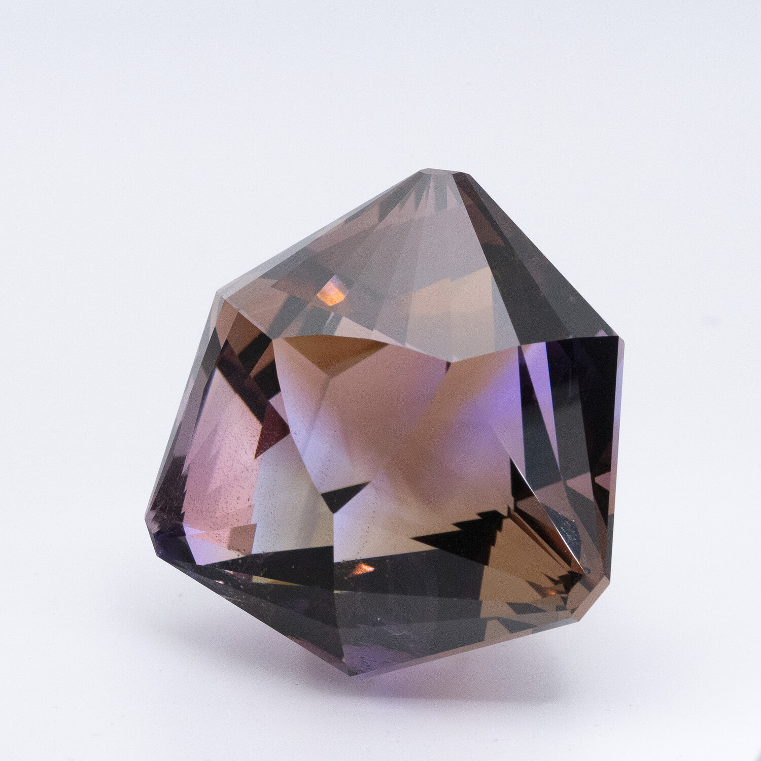 Ametrine is a unique combination of amethyst and citrine and this huge and gorgeously colored 322 carat faceted specimen from Bolivia is one of the most professional cutting jobs we've ever seen. From an unknown and incredibly skilled artist, this cut stone can be enjoyed glinting on a shelf or incorporated into a statement piece of jewelry.