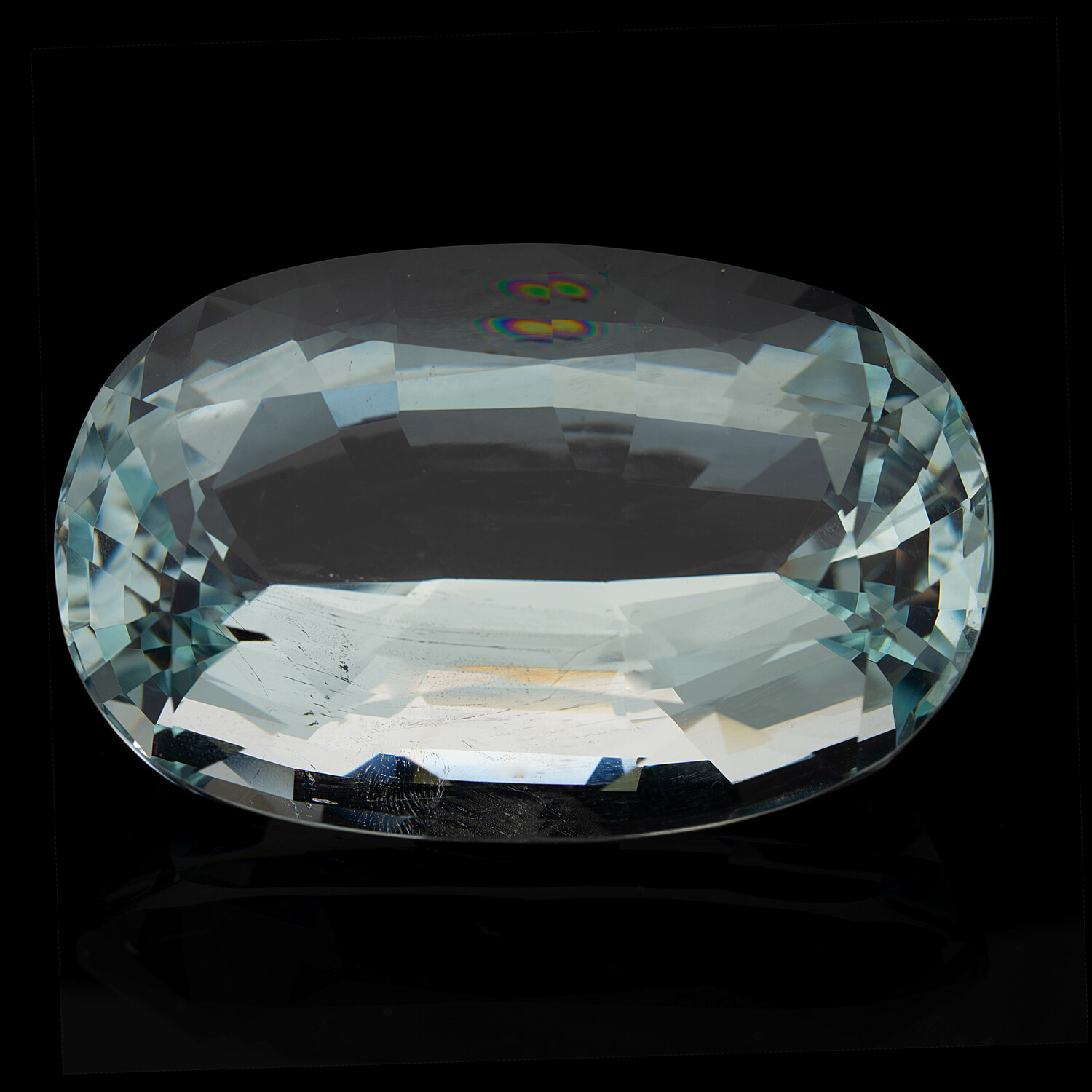 This gigantic over 113 carat faceted clear blue oval cut aquamarine is out of Brazil, the world’s most important and largest commercial source of gem-grade aquamarine – having produced the stone for three hundred years and with over twenty aquamarine sources still active across the country. A substantial specimen with flash.