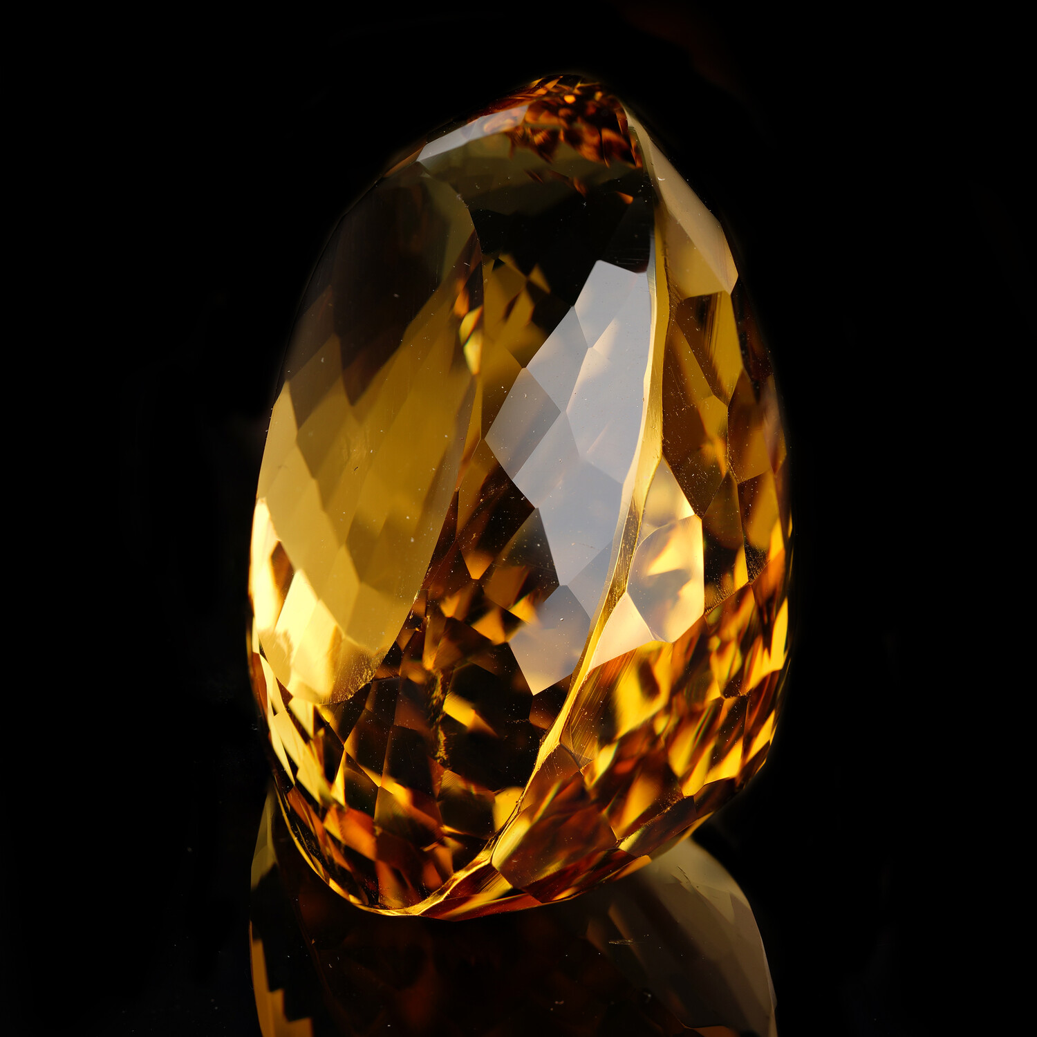 From the ancient greek "helios" meaning sun and "doros" meaning gift, heliodor is a rare variety of beryl and this flawless nearly 100 carat richly golden yellow-hued stone out of Ukraine features gorgeous clarity even with its massive size. A shining specimen.