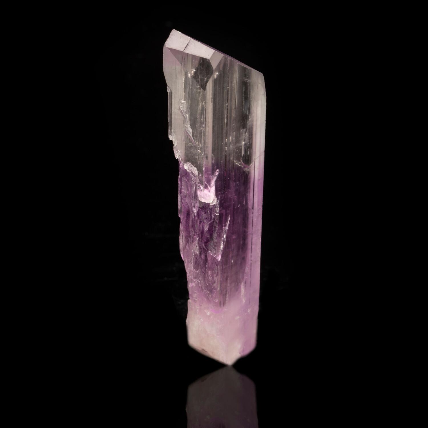 This incredibly gemmy kunzite specimen from Afghanistan features a large, beautifully formed termination and pigmentation that ranges from stunningly clear to a gorgeous, intense lilac-to-magenta that verges on electric. The prized lilac coloring comes from traces of manganese. This piece will make a special addition to any collection.