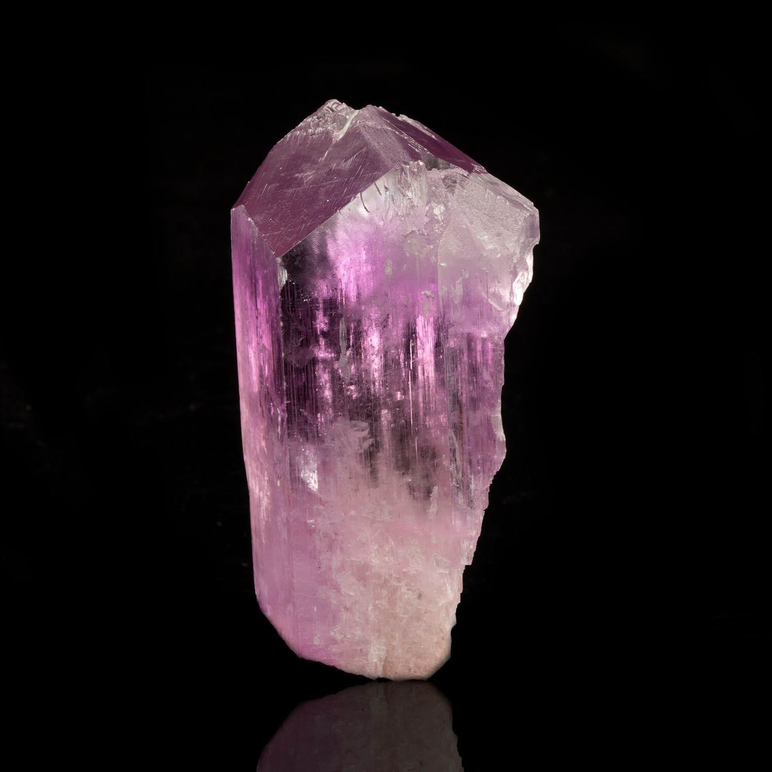 This incredibly gemmy kunzite specimen from Afghanistan features a large termination and gorgeous, intense magenta pigmentation verging on electric throughout. The prized coloring comes from traces of manganese. This piece features great clarity and will make a special addition to any collection.