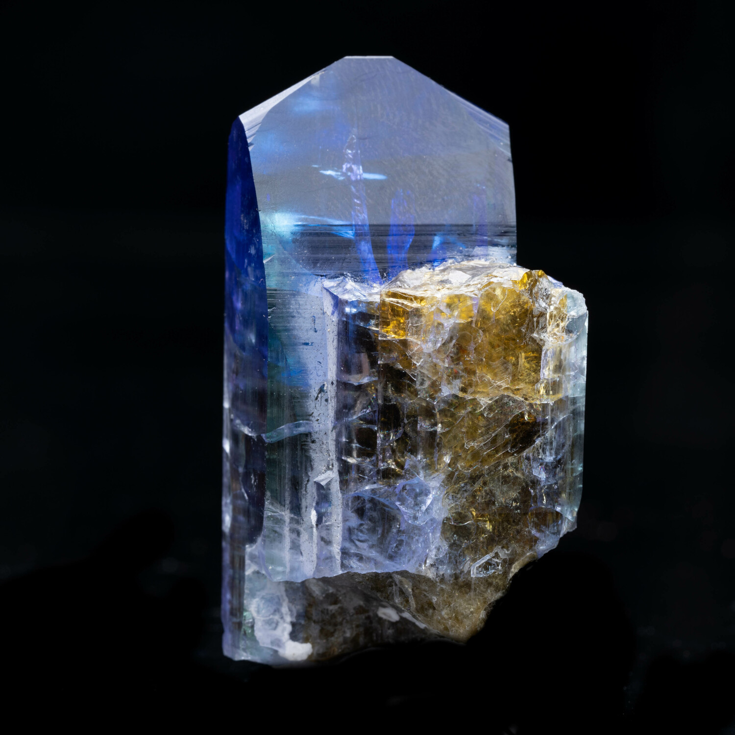 Discovered in 1967 and sourced in only one location on earth – Merelani Hills, Tanzania, near Mt. Kilimanjaro – enigmatic blue-violet or violet-blue tanzanite is one of the rarest and most prized gemstones on earth. A translucent variety of zoisite, this pleochroic gem can show red-violet, yellow-green, and blue. Most tanzanite on the market has been heat treated to enhance the blue and violet tones and reduce the yellow-green, but this spectacular specimen is completely natural, which means that its pleochroism remains fully intact. Tanzanite – initially named tanjeloffite after Astro West President Marc Tanjeloff’s grandfather Julio Tanjeloff – was first brought to the United States from Tanzania by Julio himself. It was later renamed by Tiffany & Co. This indigo gem crystal features a large, natural perfect termination and beautiful luster and a moderately sized secondary crystal growing on the back. When this specimen is lit (as in the final two photos), you can see the red and yellow-green tones spectacularly.