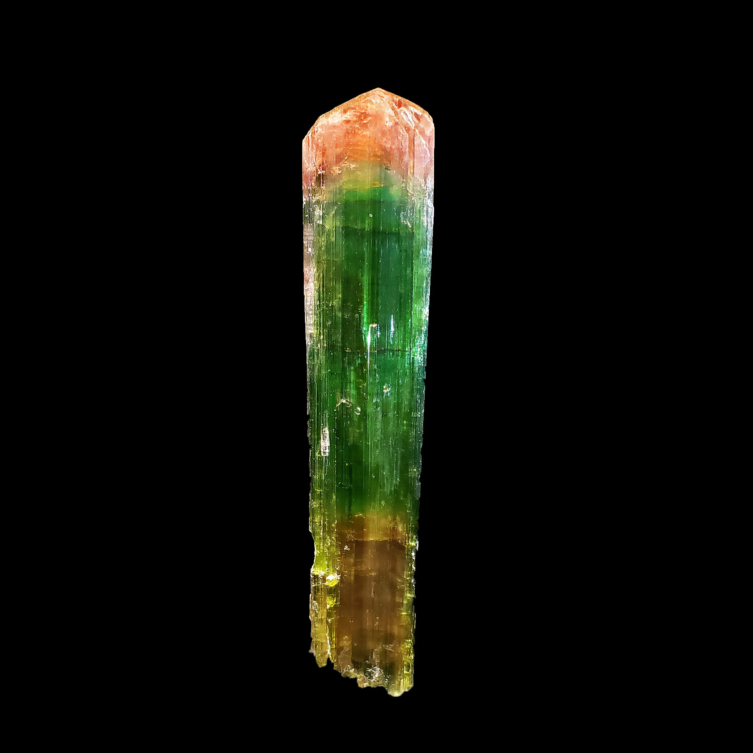 This specimen is a magnificent watermelon tourmaline from Paprok, Afghanistan. It has a beautiful purple-tinged bottom with a luminous green center and a pink cap. This piece has amazing luster and deep, contrasting colors. Very rarely do we see such an unrepaired specimen this gorgeous. A fine addition to any collection.