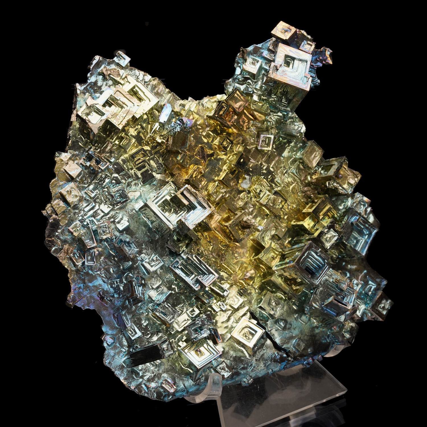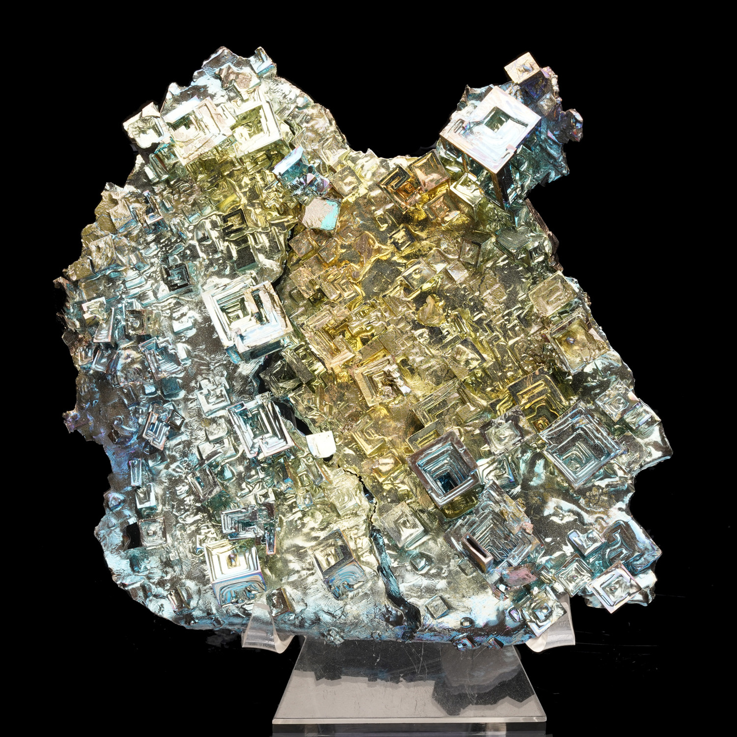 This beautiful multicolored iridescent laboratory made Bismuth crystal features beautiful vibrant alternating colors with a unique and aesthetic stairstep crystal structure.