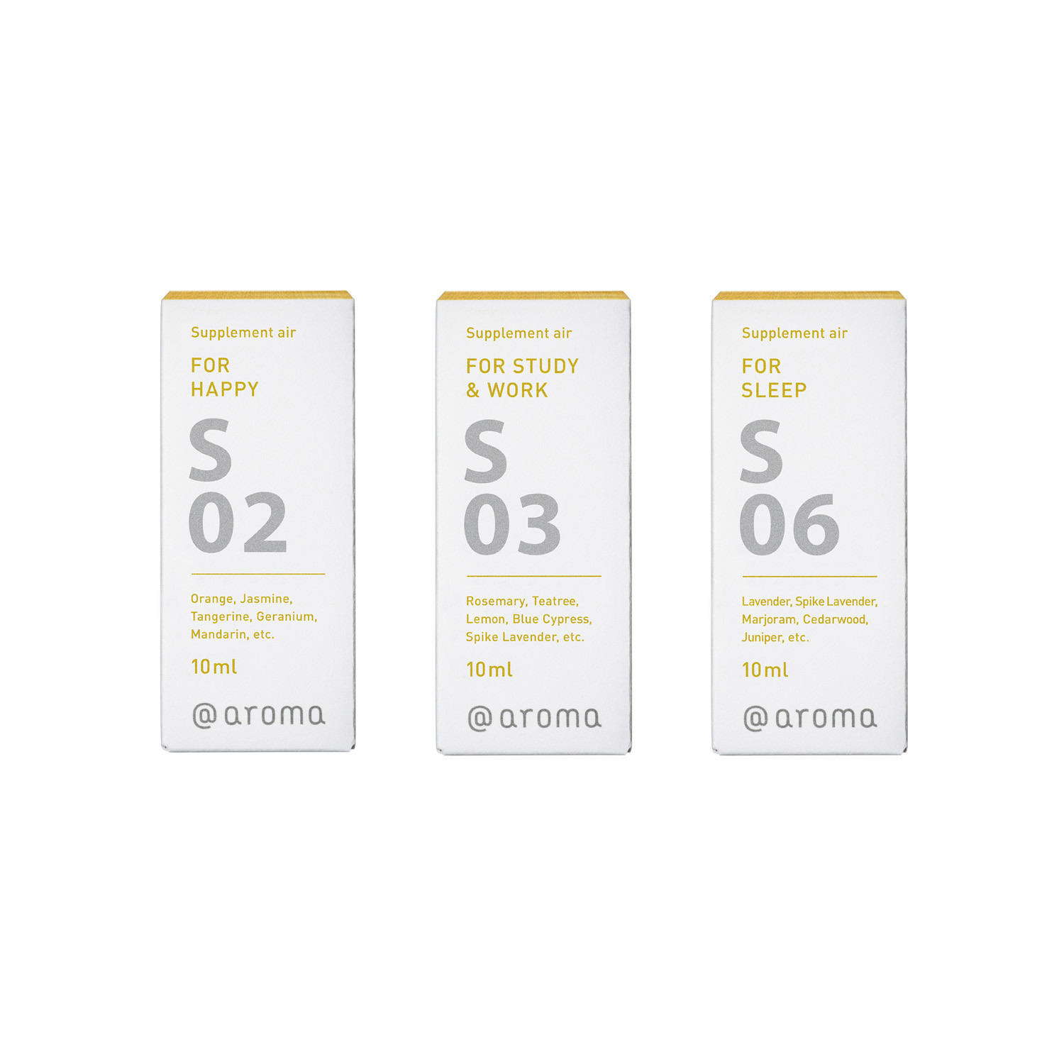 Set the mood, and refocus your mind, with the revitalizing and refocusing scents of pure, natural essential oil blends from the Supplement Air collection. This set includes 3 refreshing scents— For Study + Work, a mix of lemon, rosemary, and other herbs to improve your concentration and clear your mind; For Happy, a combination of orange and jasmine to gently coax out a cheerful, spirited mood; and finally For Sleep, designed to impart calmness and stillness, gently guiding you into a stress-free sleep.