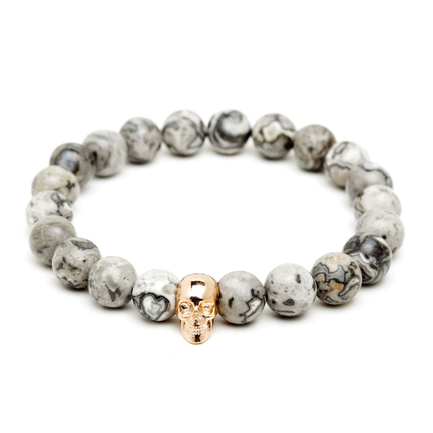 Each Atolyestone creation is a unique bracelet whose amazing materials set it apart from the norm, and the 18kt Rose Gold Plated Skull & Grey Jasper is no exception. Durable and long lasting, this imaginative piece is perfect for stacking, but stands alone with style. Instantly recognizable as being made by this innovative brand, this bracelet boasts the best in jasper and rose gold.