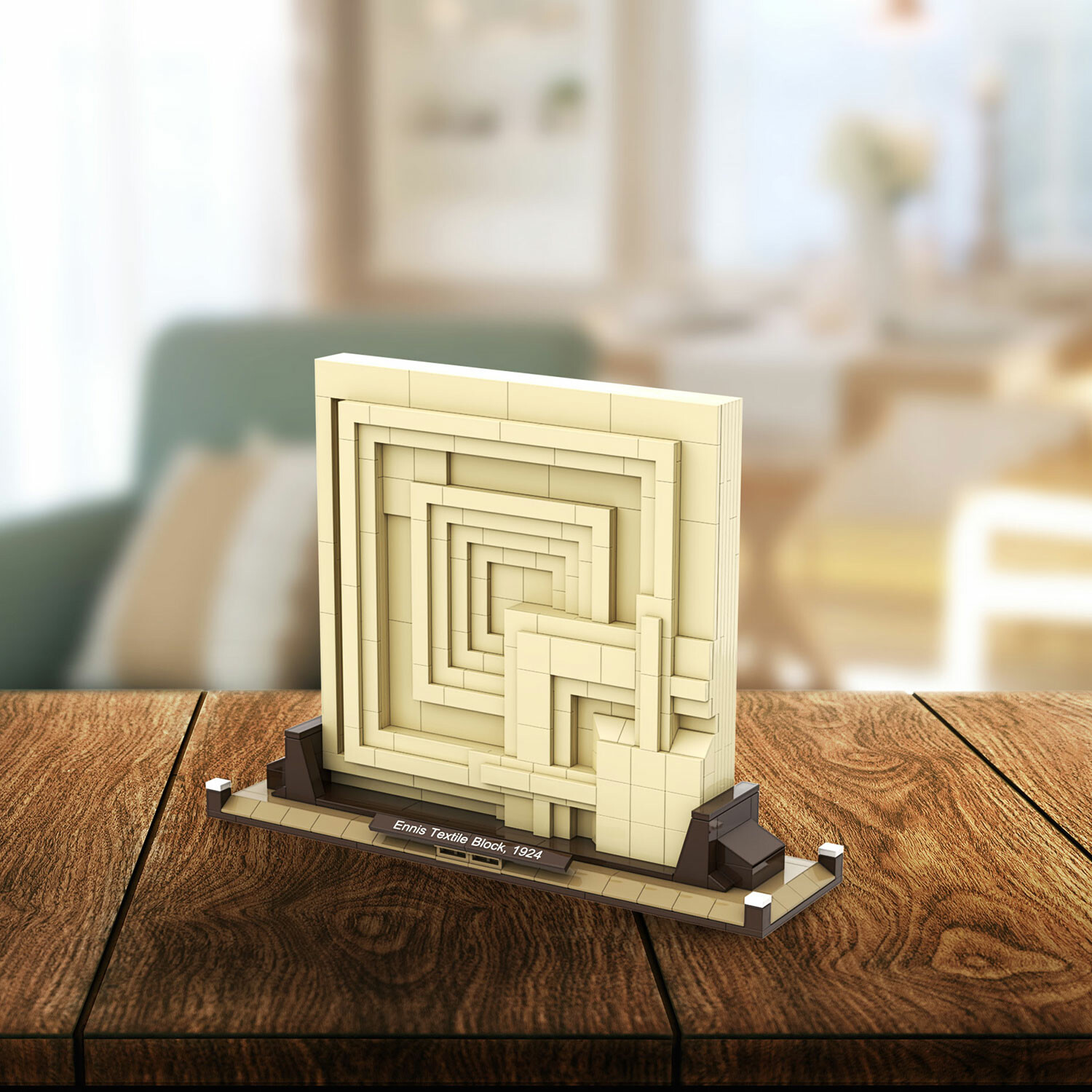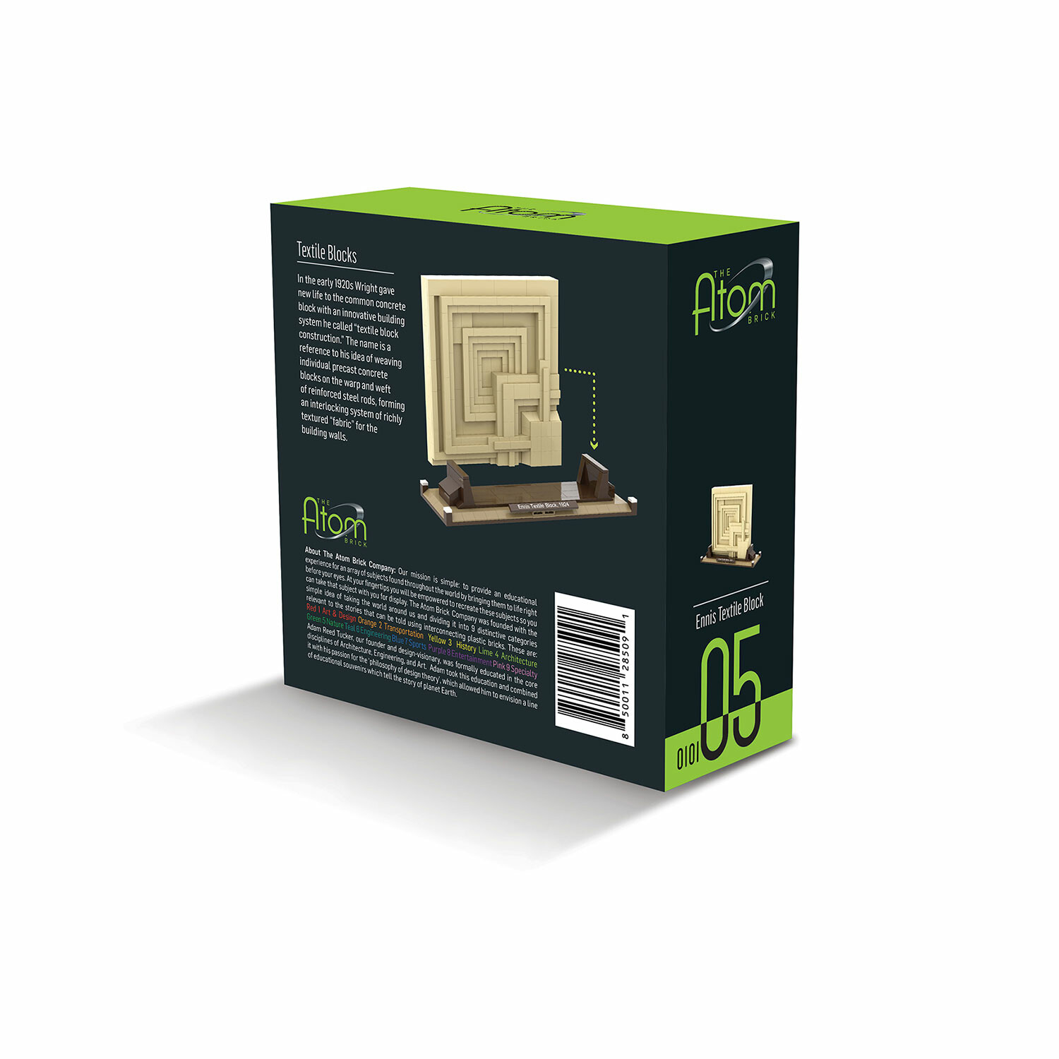 With the Ennis Textile Block set from The Atom Brick, builders will construct the textile block detail from The Ennis House designed by Wright in 1923 and built by his son Lloyd in 1924. Evoking the look of a Mayan Temple, The Ennis House was the last monumental and complex of the four textile block homes Wright designed in the Los Angeles area.