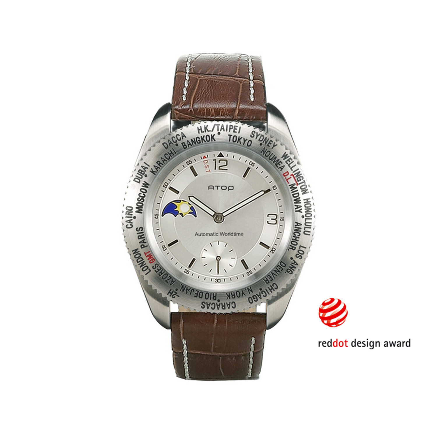 The purpose of the Wws design is to deliver the concept of precision mechanism. The watch case is made with several complex processes. With ATOP patented friendly movement, it enables the hour hand and day/night indicator to rotate automatically while turning the watch bezel. This simple yet thoughtful world time wristwatch is a timepiece classic. This model earned the German red dot design award.